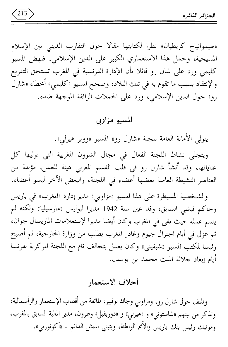 "طيموانياج كريطيان" نظرا لكتابتها مقالا حول التقارب الديني بين الإسلام المسيحية، وحمل هذا الاستعماري الكبير على الدين الإسلامي. فنهض المسيو كليمي ورد على شال رو قائلا بأن الإدارة الفرنسية في المغرب تستحق التقريع والانتقاد بسبب ما تقوم به في تلك البلاد، وصحح المسيو "كليمي" أخطاء "شارل رو" حول الدين الإسلامي، ورد على الحملات الزائفة الموجهة ضده.