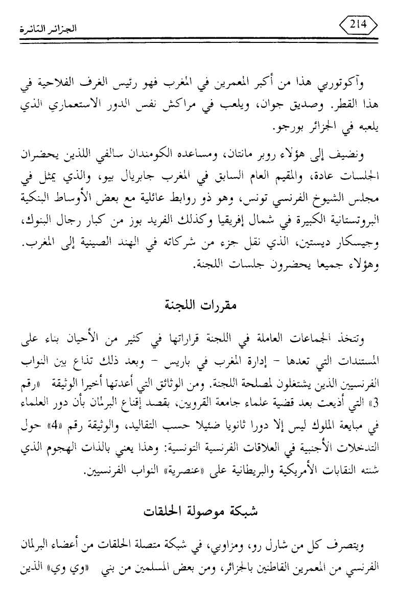 ونضيف إلى هؤلاء روبر مانتان، ومساعده الكومندان سالفي اللذين يحضران الجلسات عادة، والمقيم العام السابق في المغرب جابريال بيو، والذي يمثل في مجلس الشيوخ الفرنسي تونس، وهو ذو روابط عائلية مع بعض الأوساط البنكية البروتستانية الكبيرة في شمال إفريقيا وكذلك الفريد بوز من كبار رجال البنوك، وجيسكار ديستين، الذي نقل جزء من شركاته في الهند الصينية إلى المغرب. وهؤلاء جميعا يحضرون جلسات اللجنة.
