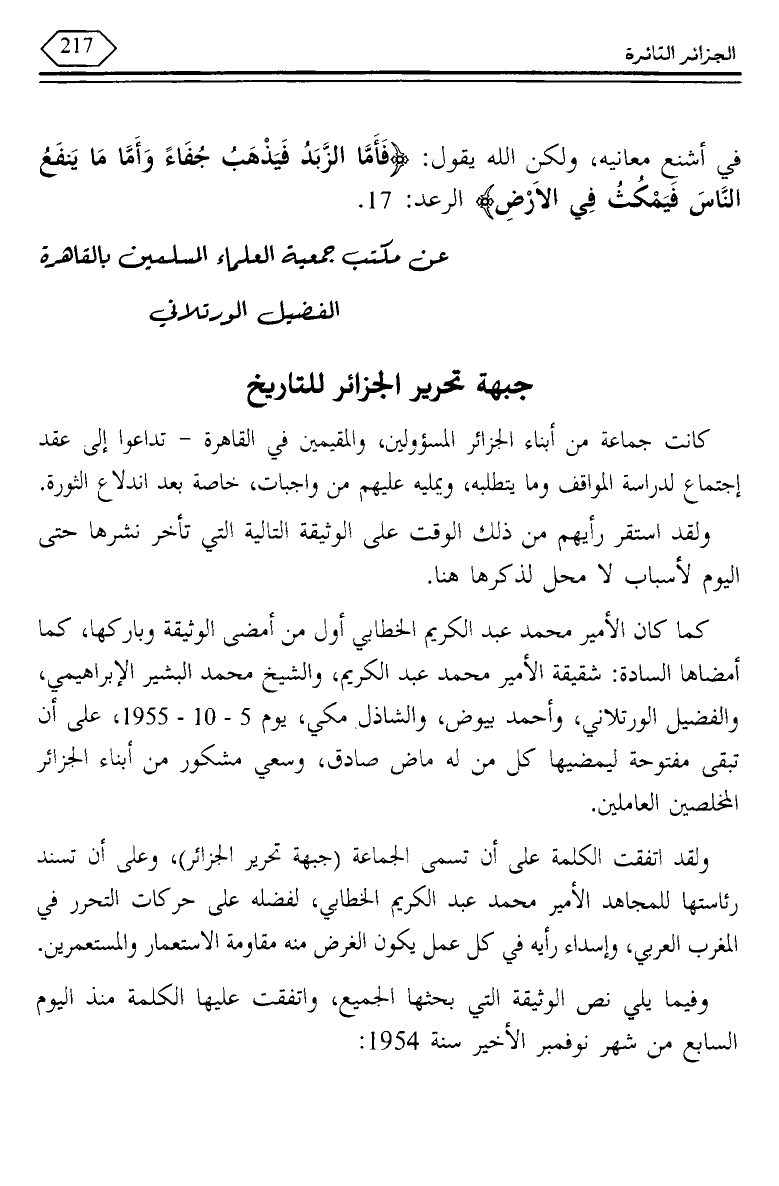 وفيما يلي نص الوثيقة التي بحثها الجميع، واتفقت عليها الكلمة منذ اليوم السابع من شهر نوفمبر الأخير سنة 1954: