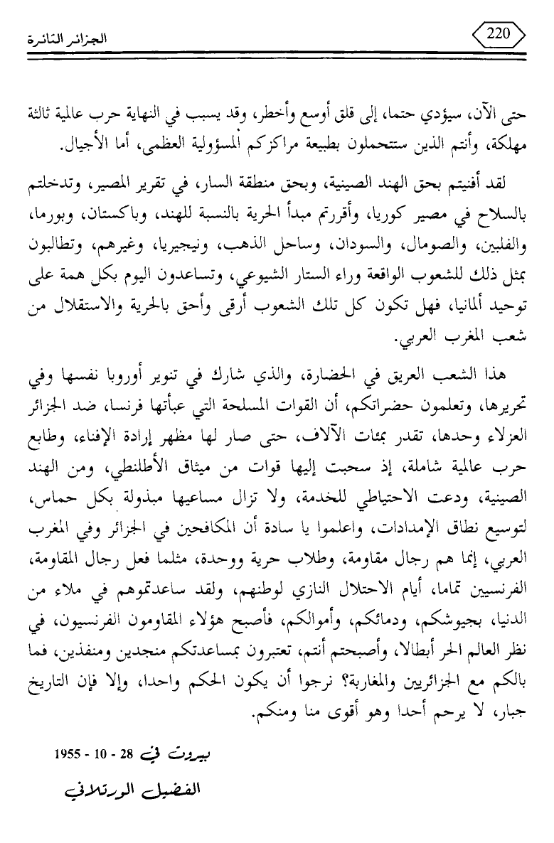 هذا الشعب العريق في الحضارة، والذي شارك في تنوير أوروبا نفسها وفي تحريرها، وتعلمون حضراتكم، أن القوات المسلحة التي عبأتها فرنسا، ضد الجزائر العزلاء وحدها، تقدر بمئات الآلاق، حتى صار لها مظهر إرادة الإفناء، وطابع حرب عالمية شاملة، إذ سبت إليها قوات من ميثاق الأطلنطي، ومن الهند الصينية، ودعت الاحتياطى للخدمة، ولا تزال مساعيها مبذولة بكل حماس، لتوسيع نطاق الامدادات، واعلموا يا سادة أن المكافحين في الجزائر وفي المغرب العربي، إنما هم رجال مقاومة، وطلاب حرية ووحدة، مثلما فعل رجال المقاومة، الفرنسيين تماما، أيام الاحتلال النازي لوطنهم، ولقد ساعدتموهم في ملاء من الدنيا، بجيوشكم، ودمائكم، وأموالكم، فأصبح هؤلاء المقاومون الفرنسيون، في نظر العالم الحر أبطالا، وأصبحتم أنتم، تعتبرون بمساعدتكم منجدين ومنفذين، فما بالكم مع الجزائريين والمغاربة؟ نرجوا أن يكون الحكم واحدا، وإلا فإن التاريخ جبار، لا يرحم أحدا وهو أقوى منا ومنكم.