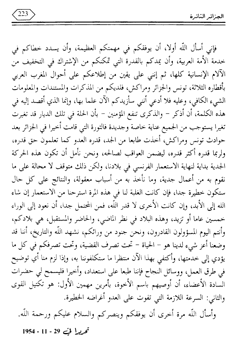 فإني أسأل الله أولا، أن يوفقكم في مهمتكم العظيمة، وأن يسدد خطاكم في خدمة الأمة العربية، وأن يمدكم بالقدرة التي تمكنكم من الإشراك في التخفيف من الآلام الإنسانية كلها، ثم إنني على يقين من إطلاعكم على أحوال المغرب العربي بأقطاره الثلاثة، تونس والجزائر ومراكش، فلديكم من المذكرات والمستندات والمعلومات الشيء الكافي، وعليه فلا أدعي أنني سأزيدكم الآن علما بها، وإنما الذي أقصد إليه في هذه الكلمة، أن أذكر - والذكرى تنفع المؤمنين - بأن الحلة في تلك الديار قد تغيرت تغيرا يستوجب من الجمع عناية خاصة وجديدة فالثورة التي قامت أخيرا في الجزائر بعد حوادث تونس ومراكش، أخذت طابعا من الجد، قدره العدو لما تعلمون حق قدره، ولربما قدره أكثر قدره، ليضمن العواقب لصالحه، ونحن نأمل أن تكون هذه الحركة الجدية بداية لنهاية الاستعمار الفرنسي في بلادنا، ولكن ذلك متوقف لا محالة على ما نقوم به من أعمال جدية، وما نأخذ به من أسباب معقولة، والنتائج على كل حال ستكون خطيرة جدا، فإن كانت الغلبة لنا في هذه المرة استرحنا من الاستعمار إن شاء الله إلى الأبد، وإن كانت الأخرى لا قدر الله، فمن المحتمل جدا، أن نعود إلى الوراء خمسين عاما أو تزيد، وهذه البلاد في نظر الماضي، والحاضر والمستقبل، هي بلادكم، وأنتم اليوم المسؤولون القادرون، ونحن جنود من ورائكم، نشهد الله والتاريخ، أننا قد وضعنا أعز شيء لدينا هو - الحياة - تحت تصرف القضية، وتحت تصرفكم في كل ما يؤدي إلى خدمتها، وأكتفي بهذا الآن منتظرا ما ستكلفوننا به، وإذا لزم منا أي توضيح في طرق العمل، ووسائل النجاح فإننا طبعا على استعداد، وأخيرا فليسمح لي حضرات السادة الأعضاء، أن أوصيهم باسم الأخوة، بأمرين مهمين الأول: هو تكتيل القوى والثاني: السرعة اللازمة التي تفوت على العدو أغراضه الخطيرة.