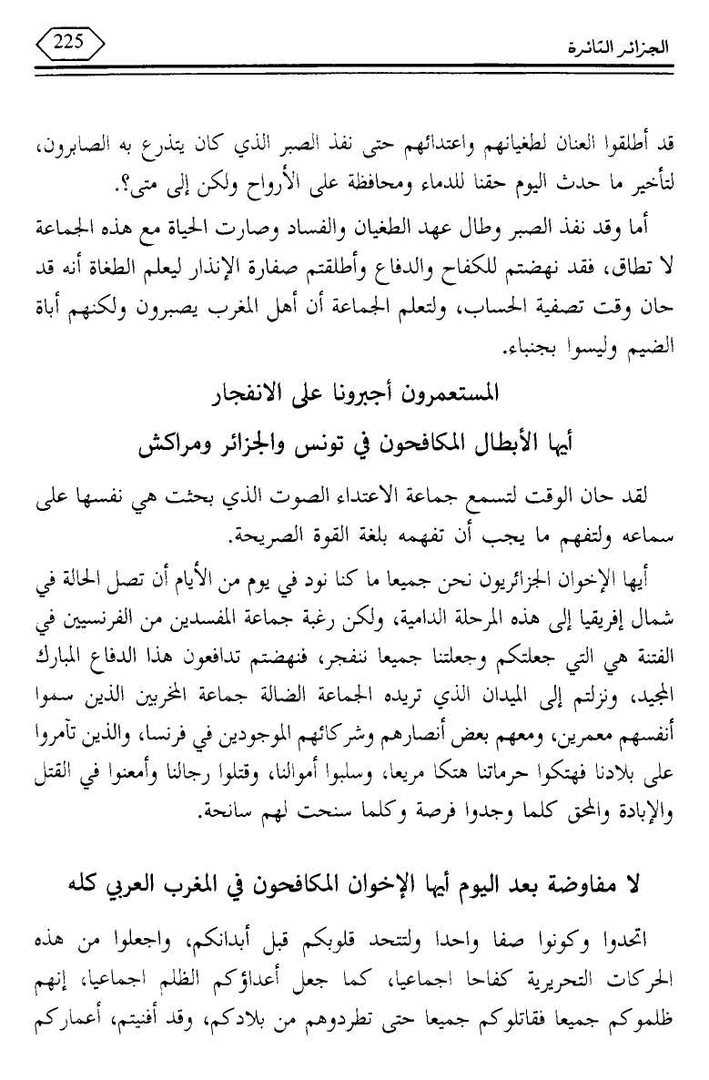 أيها الإخوان الجزائريون نحن جميعا ما كنا نود في يوم من الأيام أن تصل الحالة في شمال إفريقيا إلى هذه المرحلة الدامية، ولكن رغبة جماعة المفسدين من الفرنسيين في الفتنة هي التي جعلتكم وجعلتنا جميعا ننفجر، فنهضتم تدافعون هذا الدفاع المبارك المجيد، ونزلتم إلى الميدان الذي تريده الجماعة الضالة جماعة المخربين الذين سموا أنفسهم معمرين، ومعهم بعض أنصارهم وشركائهم الموجودين في فرنسا، والذين تآمروا على بلادنا فهتكوا حرماتنا هتكا مريعا، وسلبوا أموالنا، وقتلوا رجالنا وأمعنوا في القتل والإبادة والمحق كلما وجدوا فرصة وكلما سنحت لهم سانحة.