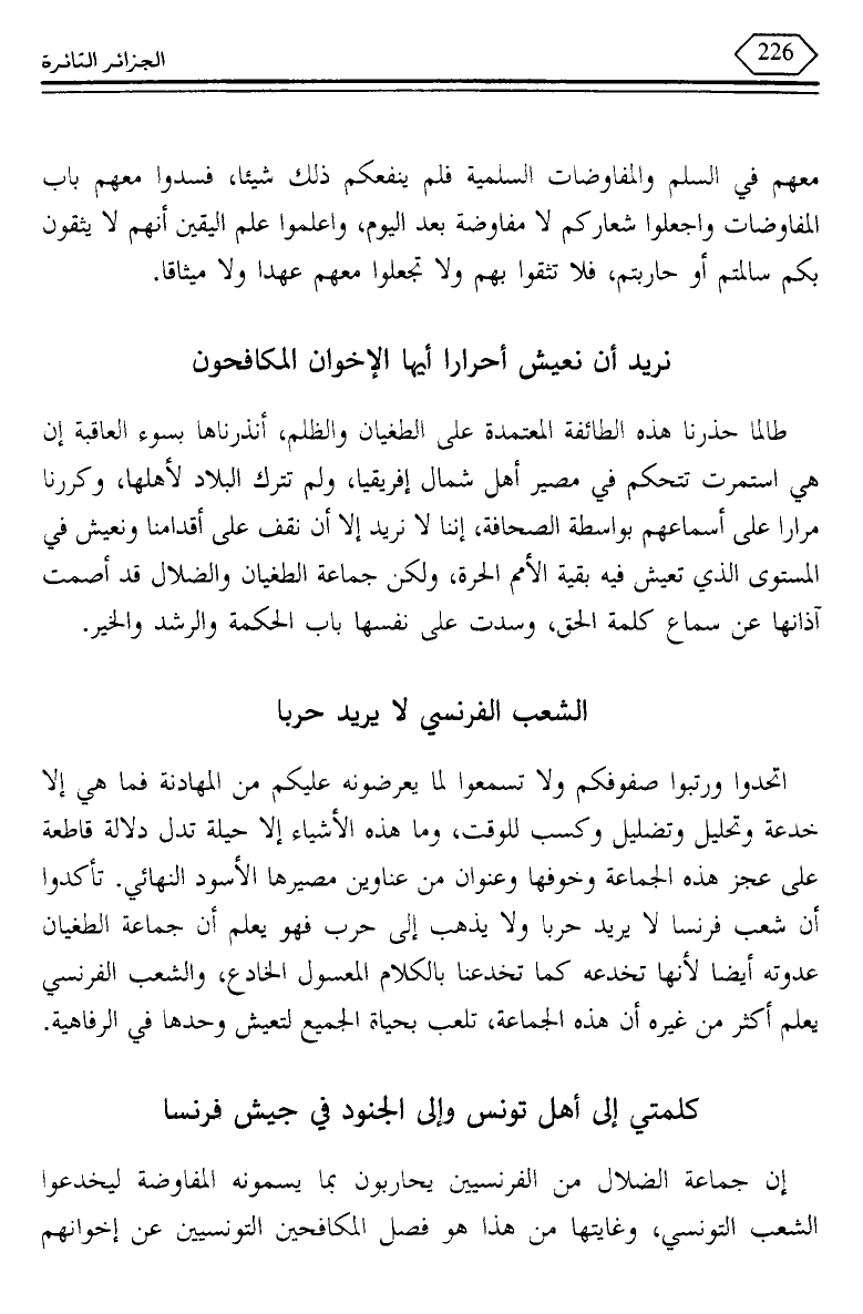 إن جماعة الضلال من الفرنسيين يحاربون بما يسمونه المفاوضة ليخدعوا الشعب التونسي، وغايتها من هذا هو فصل المكافحين التونسيين عن إخوانهم
