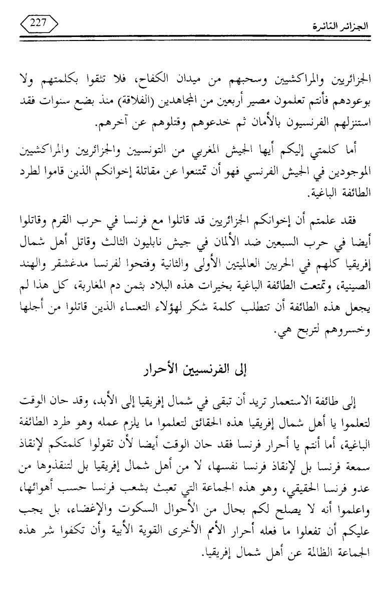 إلى طائفة الاستعمار تريد أن تبقى في شمال إفريقيا إلى الأبد، وقد حان الوقت لتعلموا يا أهل شمال إفريقيا هذه الحقائق لتعلموا ما يلزم عمله وهو طرد الطائفة الباغية، أما أنتم يا أحرار فرنسا فقد حان الوقت أيضا لأن تقولوا كلمتكم لإنقاذ سمعة فرنسا بل لإنقاذ فرنسا نفسها، لا من أهل شمال إفريقيا بل لتنقذوها من عدو فرنسا الحقيقي، وهو هذه الجماعة التي تعبث بشعب فرنسا حسب أهوائها، واعلموا أنه لا يصلح لكم بحال من الأحوال السكوت والإغضاء، بل يجب عليكم أن تفعلوا ما فعله أحرار الأمم الأخرى القوية الأبية وأن تكفوا شر هذه الجماعة الظالمة عن أهل شمال إفريقيا.