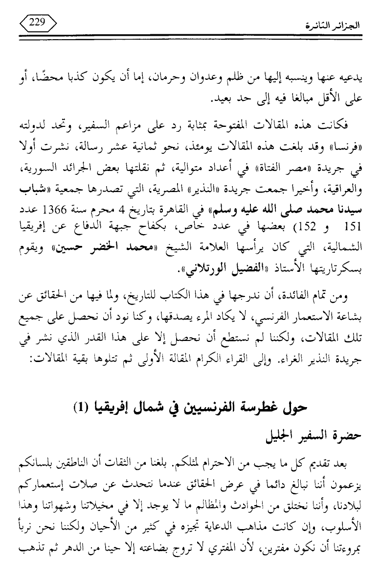 ومن تمام الفائدة، أن تدرجها في هذا الكتاب للتاريخ، ولما فيها من الحقائق عن بشاعة الاستعمار الفرنسي، لا يكاد المرء يصدقها، وكنا نود أن نحصل على جميع تلك المقالات، ولكننا لم نستطع أن نحصل إلا على هذا القدر الذي نشر في جريدة النذير الغراء. وإلى القراء الكرام المقالة الأولى ثم تتلوها بقية المقالات:
