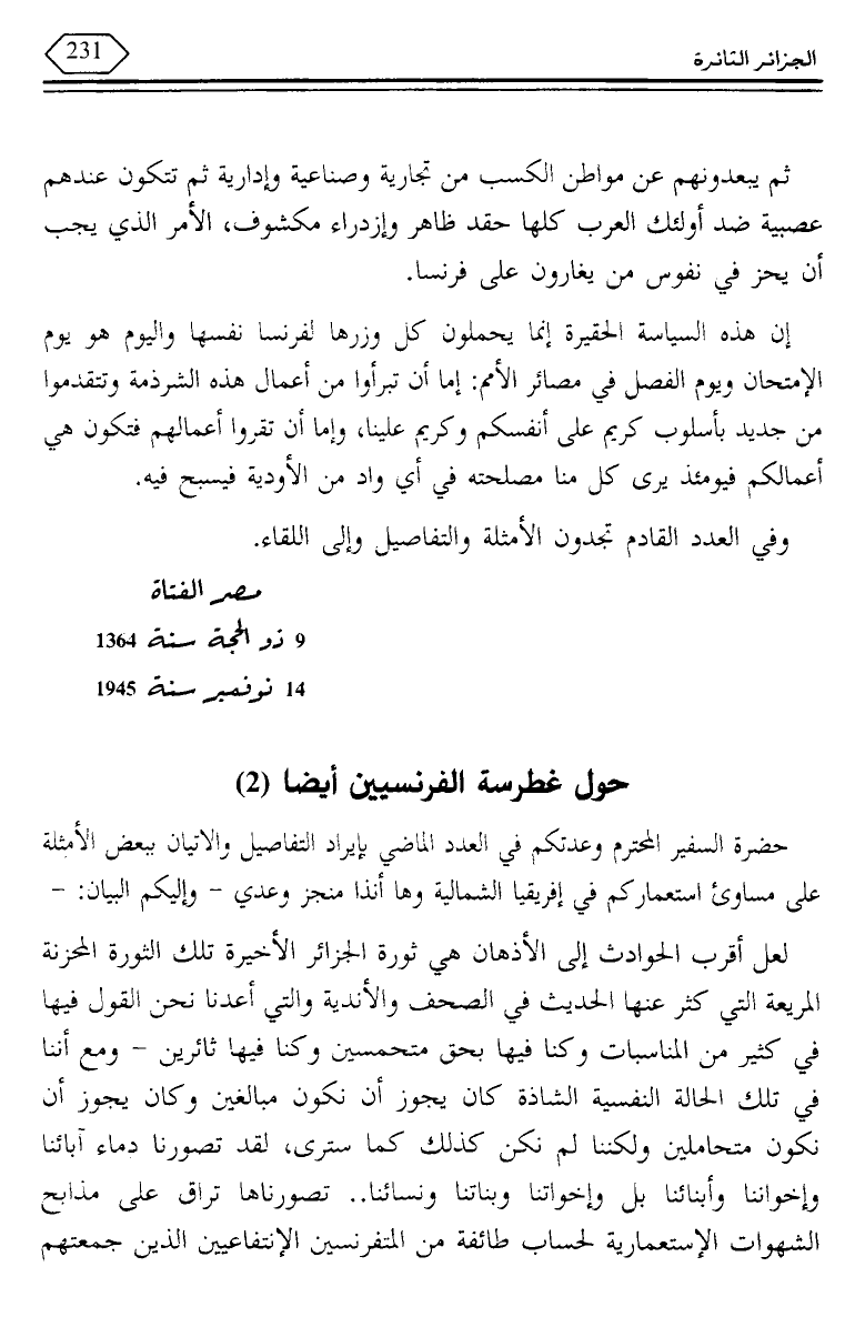 لعل أقرب الحوادث إلى الأذهان هي ثورة الجزائر الأخيرة تلك الثورة المحزنة المريعة التي كثر عنها الحديث في الصحف والأندية والتي أعدنا نحن القول فيها في كثير من المناسبات وكنا فيها بحق متحمسين وكنا فيها ثائرين - ومع أننا في تلك الحالة النفسية الشاذة كان يجوز أن نكون مبالغين وكان يجوز أن نكون متحاملين ولكننا لم نكن كذلك كما سترى، لقد تصورنا دماء آبائنا وإخواننا وأبنائنا بل وإخواتنا وبناتنا ونسائنا .. تصورناها تراق على مذابح الشهوات الاستعمارية لحساب طائفة من المتفرنسين الانتفاعيين الذين جمعتهم
