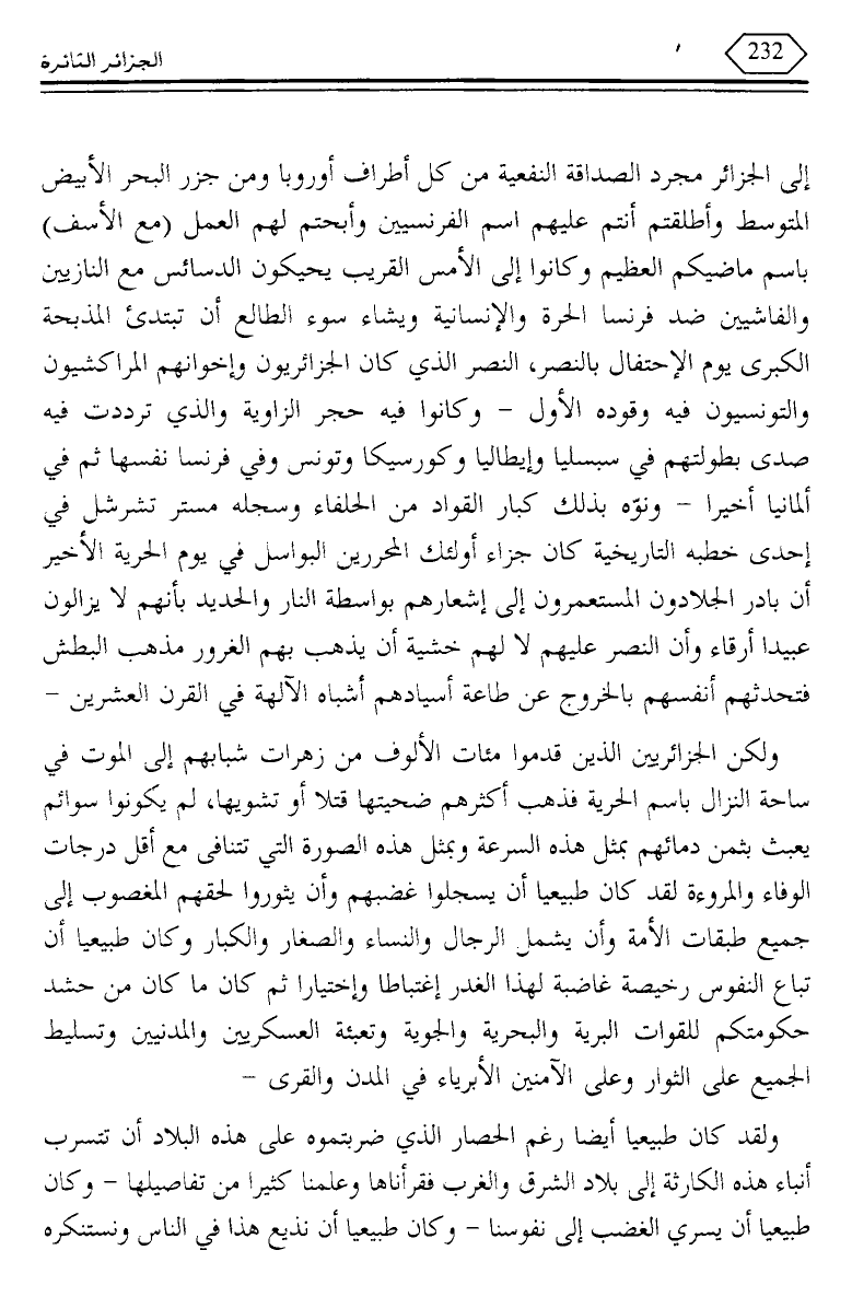 إلى الجزائر مجرد الصداقة النفعية من كل أطراف أوروبا ومن جزر البحر الأبيض المتوسط وأطلقتم أنتم عليهم اسم الفرنسيين وأبحتم لهم العمل (مع الأسف) باسم ماضيكم العظيم وكانوا إلى الأمس القريب يحيكون الدسائس مع النازيين والفاشيين ضد فرنسا الحرة والإنسانية ويشاء سوء الطالع أن تبتدئ المذبحة الكبرى يوم الاحتفال بالنصر، النصر الذي كان الجزائريون وإخوانهم المراكشيون والتونسيون فيه وقوده الأول - وكانوا فيه حجر الزاوية والذي ترددت فيه صدى بطولتهم في سبسليا وإيطاليا وكورسيكا وتونس وفي فرنسا نفسها ثم في ألمانيا أخيرا - ونوه بذلك كبار القواد من الحلفاء وسجله مستر تشرشل في إحدى خطبه التاريخية كان جزاء أولئك المحررين البواسل في يوم الحرية الأخير أن بادر الجلادون المستعمرون إلى إشعارهم بواسطة النار والحديد بأنهم لا يزالون عبيدا أرقاء وأن النصر عليهم لا لهم خشية أن يذهب بهم الغرور مذهب البطش فتحدثهم أنفسهم بالخروج عن طاعة أسيادهم أشباه الآلهة في القرن العشرين.