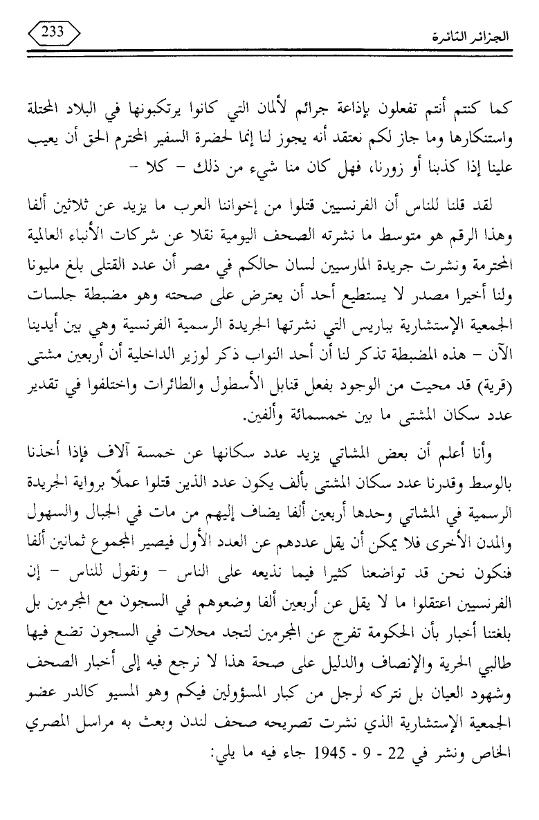 لقد قلنا للناس أن الفرنسيين قتلوا من إخواننا العرب ما يزيد عن ثلاثين ألفا وهذا الرقم هو متوسط ما نشرته الصحف اليومية نقلا عن شركات الأنباء العالمية المحترمة ونشرت جريدة المارسيين لسان حالكم في مصر أن عدد القتلى بلغ مليونا ولنا أخيرا مصدر لا يستطيع أحد أن يعترض على صحته وهو مضبطة جلسات الجمعية الاستشارية بباريس التي نشرتها الجريدة الرسمية الفرنسية وهى بين أيدينا الآن - هذه المضبطة تذكر لنا أن أحد النواب ذكر لوزير الداخلية أن أربعين مشتى (قرية) قد محيت من الوجود بفعل قنابل الأسطول والطائرات واختلفوا في تقدير عدد سكان المشتى ما بين خمسمائة وألفين.