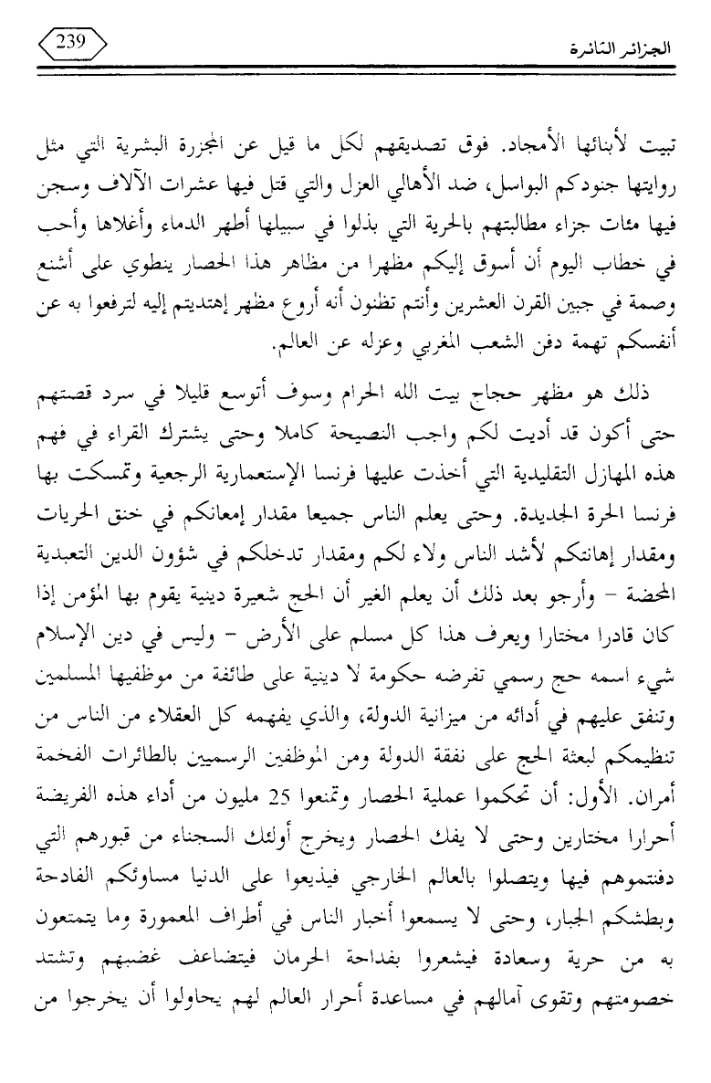 ذلك هو مظهر حجاج بيت الله الحرام وسوف أتوسع قليلا في سرد قصتهم حتى أكون قد أديت لكم واجب النصيحة كاملا وحتى يشترك القراء في فهم هذه المهازل التقليدية التي أخذت عليها فرنسا الاستعمارية الرجعية وتمسكت بها فرنسا الحرة الجديدة. وحتى يعلم الناس جميعا مقدار إمعانكم في خنق الحريات ومقدار إهانتكم لأشد الناس ولاء لكم ومقدار تدخلكم في شؤون الدين التعبدية المحضة - وأرجو بعد ذلك أن يعلم الغير أن الحج شعيرة دينية يقوم بها المؤمن إذا كان قادرا مختارا ويعرف هذا كل مسلم على الأرض - وليس في دين الإسلام شيء اسمه حج رسمي تفرضه حكومة لا دينية على طائفة من موظفيها المسلمين وتنفق عليهم في أدائه من ميزانية الدولة، والذي يفهمه كل العقلاء من الناس من تنطيمكم لبعثة الحج على نفقة الدولة ومن الموظفين الرسميين بالطائرات الفخمة أمران. الأول: أن تحكموا عملية الحصار وتمنعوا 25 مليون من أداء هذه الفريضة أحرارا مختارين وحتى لا يفك الحصار ويخرج أولئك السجناء من قبورهم التي دفنتموهم فيها ويتصلوا بالعالم الخارجي فيذيعوا على الدنيا مساوئكم الفادحة وبطشكم الجبار، وحتى لا يسمعوا أخبار الناس في أطراف المعمورة وما يتمتعون به من حرية وسعادة فيشعروا بفداحة الحرمان فيتضاعف غضبهم وتشتد خصومتهم وتقوى آمالهم في مساعدة أحرار العالم لهم يحاولوا أن يخرجوا من
