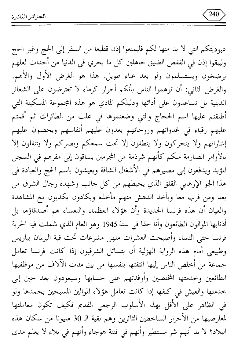 والغرض الثاني: أن توهموا الناس بأنكم أحرار كرماء لا تعترضون على الشعائر الدينية بل تساعدون على أدائها ودليلكم المادي هو هذه المجموعة المسكينة التي أطلقتم عليها اسم الحجاج والتي وضعتموها في علب من الطائرات ثم أقمتم عليهم رقباء في غدواتهم وروحاتهم يعدون عليهم أنفاسهم ويحصون عليهم إشاراتهم ولا يتحركون ولا ينطقون إلا تحت سمعكم وبصركم ولا ينتقلون إلا بالأوامر الصارمة منكم كأنهم شرذمة من المجرمين يساقون إلى مقرهم في السجن المؤبد ويدفعون إلى مصيرهم في الأشغال الشاقة ويعيشون باسم الحج والعبادة في هذا الجو الإرهابي القلق الذي يحيطهم من كل جانب وشهده رجال الشرق من بعد ومن قرب معا ويأخذ الدهش منهم مأخذه ويكادون يكذبون مع المشاهدة والعيان أن هذه فرنسا الجديدة وأن هؤلاء العظماء والتعساء هم أصدقاؤها بل أذنابها الموالون الطائعون وأنا حقا في سنة 1945 وهو العام الذي شملت فيه الحرية فرنسا حتى النساء وأصحاب العشرات منهن مشرعات تحت قبة البرلمان بباريس وطبيعي أمام هذه الرواية الهزلية أن يتسائل الشرقيون إذا كانت فرنسا تعامل جماعة من أخلص الناس إليها انتقتها بنفسها من بين مئات الآلاف من موظفيها الطائعين وخدمتها المخلصين وأوفدتهم على حسابها وسيعود ون بعد حين إلى خدمتها والعيش في كنفها إذا كانت تعامل هؤلاء الموالين المسبحين بحمدها ولو في الظاهر على الأقل بهذا الأسلوب الرجعي القديم فكيف تكون معاملتها لمعارضيها من الأحرار الساخطين الثائرين وهم بقية الـ 30 مليونا من سكان هذه البلاد؟ لا بد أنهم شر مستطير وأنهم في فتنة هوجاء وأنهم في بلاء لا يعلم مدى