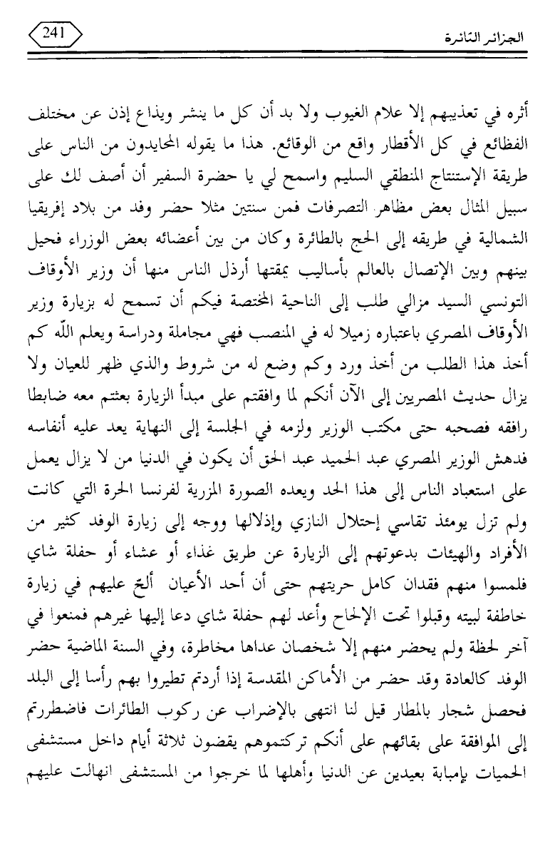 أثره في تعذيبهم إلا علام الغيوب ولا بد أن كل ما ينشر ويذاع إذن عن مختلف الفظائع في كل الأقطار واقع من الوقائع. هذا ما يقوله المحايدون من الناس على طريقة الاستنتاج المنطقي السليم واسمح لي يا حضرة السفير أن أصف لك على سبيل المثال بعض مظاهر التصرفات فمن سنتين مثلا حضر وفد من بلاد إفريقيا الشمالية في طريقه إلى الحج بالطائرة وكان من بين أعضائه بعض الوزراء فحيل بينهم وبين الاتصال بالعالم بأساليب يمقتها أرذل الناس منها أن وزير الأوقاف التونسي السيد مزالي طلب إلى الناحية المختصة فيكم أن تسمح له بزيارة وزير الأوقاف المصري باعتباره زميلا له في المنصب فهي مجاملة ودراسة ويعلم الله كم أخذ هذا الطلب من أخذ ورد وكم وضع له من شروط والذي ظهر للعيان ولا يزال حديث المصريين إلى الآن أنكم لما وافقتم على مبدأ الزيارة بعثتم معه ضابطا رافقه فصحبه حتى مكتب الوزير ولزمه في الجلسة إلى النهاية يعد عليه أنفاسه فدهش الوزير المصري عبد الحميد عبد الحق أن يكون في الدنيا من لا يزال يعمل على استعباد الناس إلى هذا الحد ويعده الصورة المزرية لفرنسا الحرة التي كانت ولم تزل يومئذ تقاسي احتلال النازي وإذلالها ووجه إلى زيارة الوفد كثير من الأفراد والهيئات بدعوتهم إلى الزيارة عن طريق غذاء أو عشاء أو حفلة شاي فلمسوا منهم فقدان كامل حريتهم حتى أن أحد الأعيان ألح عليهم في زيارة خاطفة لبيته وقبلوا تحت الإلحاح وأعد لهم حفلة شاي دعا إليها غيرهم فمنعوا في آخر لحظة ولم يحضر منهم إلا شخصان عداها مخاطرة، وفي السنة الماضية حضر الوفد كالعادة وقد حضر من الأماكن المقدسة إذا أردتم تطيروا بهم رأسا إلى البلد فحصل شجار بالمطار قيل لنا انتهى بالإضراب عن ركوب الطائرات فاضطررتم إلى الموافقة على بقائهم على أنكم تركتموهم يقضون ثلاثة أيام داخل مستشفى الحميات بإمبابة بعيدين عن الدنيا وأهلها لما خرجوا عن المستشفى انهالت عليهم