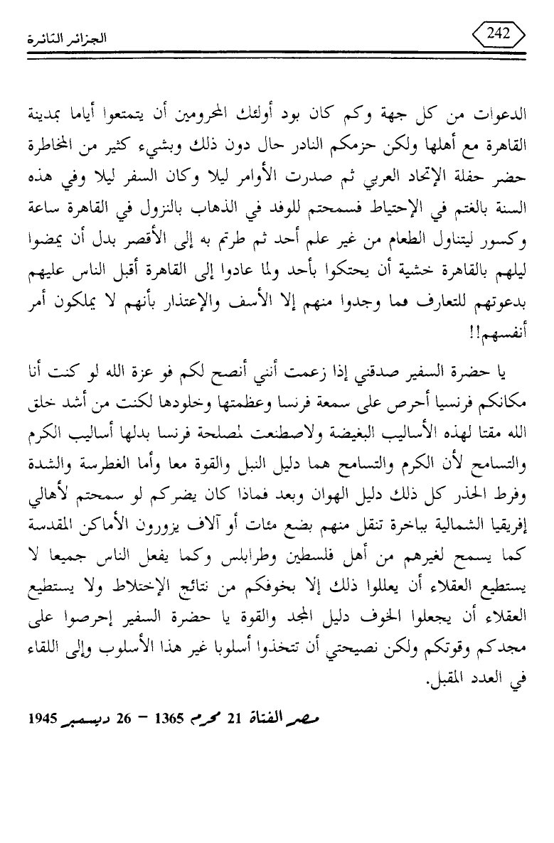 يا حضرة السفير صدقني إذا زعمت أنني أنصح لكم فو عزة الله لو كنت أنا مكانكم فرنسيا أحرص على سمعة فرنسا وعظمتها وخلودها لكنت من أشد خلق الله مقتا لهذه الأساليب البغيضة ولاصطنعت لمصلحة فرنسا بدلها أساليب الكرم والتسامح لأن الكرم والتسامح هما دليل النبل والقوة معا وأما الغطرسة والشدة وفرط الحذر كل ذلك دليل الهوان وبعد فماذا كان يضركم لو سمحتم لأهالي إفريقيا الشمالية بباخرة تنقل منهم بضع مئات أو آلاف يزورون الأماكن المقدسة كما يسمح لغيرهم من أهل فلسطين وطرابلس وكما يفعل الناس جميعا لا يستطيع العقلاء أن يعللوا ذلك إلا بخوفكم من نتائج الاختلاط ولا يستطيع العقلاء أن يجعلوا الخوف دليل المجد والقوة يا حضرة السفير احرصوا على مجدكم وقوتكم ولكن نصيحتي أن تتخذوا أسلوبا غير هذا الأسلوب وإلى اللقاء في العدد المقبل.