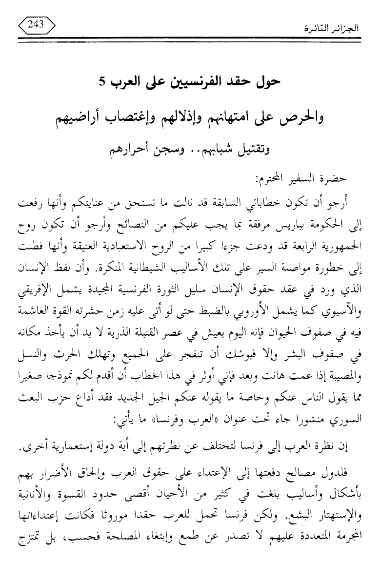 أرجو أن تكون خطاباتي السابقة قد نالت ما تستحق من عنايتكم وأنها رفعت إلى الحكومة بباريس مرفقة بما يجب عليكم من النصائح وأرجو أن تكون روح الجمهورية الرابعة قد ودعت جزءا كبيرا من الروح الاستعبادية العتيقة وأنها فطنت إلى خطورة مواصلة السير على تلك الأساليب الشيطانية المنكرة. وأن لفظ الإنسان الذي ورد في عقد حقوق الإنسان سليل الثورة الفرنسية المجيدة يشمل الإفريقي والآسيوي كما يشمل الأوروبي بالضبط حتى لو أتى عليه زمن حشرته القوة الغاشمة فيه في صفوف الحيوان فإنه اليوم يعيش في عصر القنبلة الذرية لا بد أن يأخذ مكانه في صفوف البشر وإلا فيوشك أن تنفجر على الجميع وتهلك الحرث والنسل والمصيبة إذا عمت هانت وبعد فإني أوثر في هذا الخطاب أن أقدم لكم نموذجا صغيرا مما يقول الناس عنكم وخاصة ما يقوله عنكم الجيل الحديد فقد أذاع حزب البعث السوري منشورا جاء تحت عنوان "العرب وفرنسا" ما يأتي: