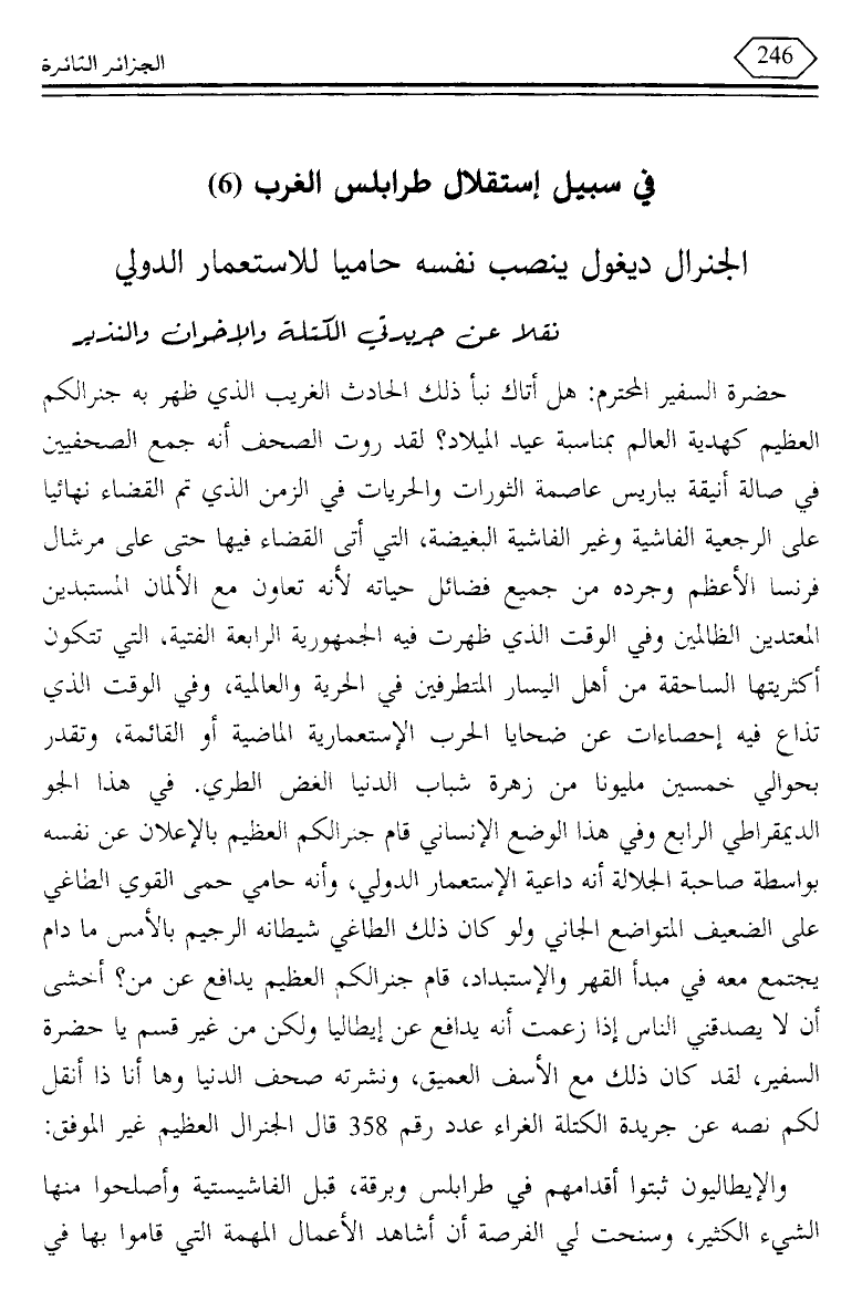 حضرة السفير المحترم: هل أتاك نبأ ذلك الحادث الغريب الذي ظهر به جنرالكم العظيم كهدية العالم بمناسبة عيد الميلاد؟ لقد روت الصحف أنه جمع الصحفيين في صالة أنيقة بباريس عاصمة الثورات والحريات في الزمن الذي تم القضاء نهائيا على الرجعية الفاشية وغير الفاشية البغيضة، التي أتى القضاء فيها حتى على مرشال فرنسا الأعظم وجرده من جميع فضائل حياته لأنه تعاون مع الألمان المستبدين المعتدين الظالمين وفي الوقت الذي ظهرت فيه الجمهورية الرابعة الفتية، التي تتكون أكثريتها الساحقة من أهل اليسار المتطرفين في الحرية والعالمية، وفي الوقت الذي تذاع فيه إحصاءات عن ضحايا الحرب الاستعمارية الماضية أو القائمة، وتقدر بحوالي خمسين مليونا من زهرة شباب الدنيا الغض الطري. في هذا الجو الديمقراطي الرابع وفي هذا الوضع الإنساني قام جنرالكم العظيم بالإعلان عن نفسه بواسطة صاحبة الجلالة أنه داعية الاستعمار الدولي، وأنه حامي حمى القوي الطاغي على الضعيف المتواضع الحاني ولو كان ذلك الطاغي شيطانه الرجيم بالأمس ما دام يجتمع معه في مبدأ القهر والاستبداد، قام جنرالكم العظيم يدافع عن من؟ أخشى أن لا يصدقني الناس إذا زعمت أنه يدافع عن إيطاليا ولكن من غير قسم يا حضرة السفير، لقد كان ذلك مع الأسف العميق، ونشرته صحف الدنيا وها أنا ذا أنقل لكم نصه عن جريدة الكتلة الغراء عدد رقم 358 قال الجنرال العظيم غير الموفق: