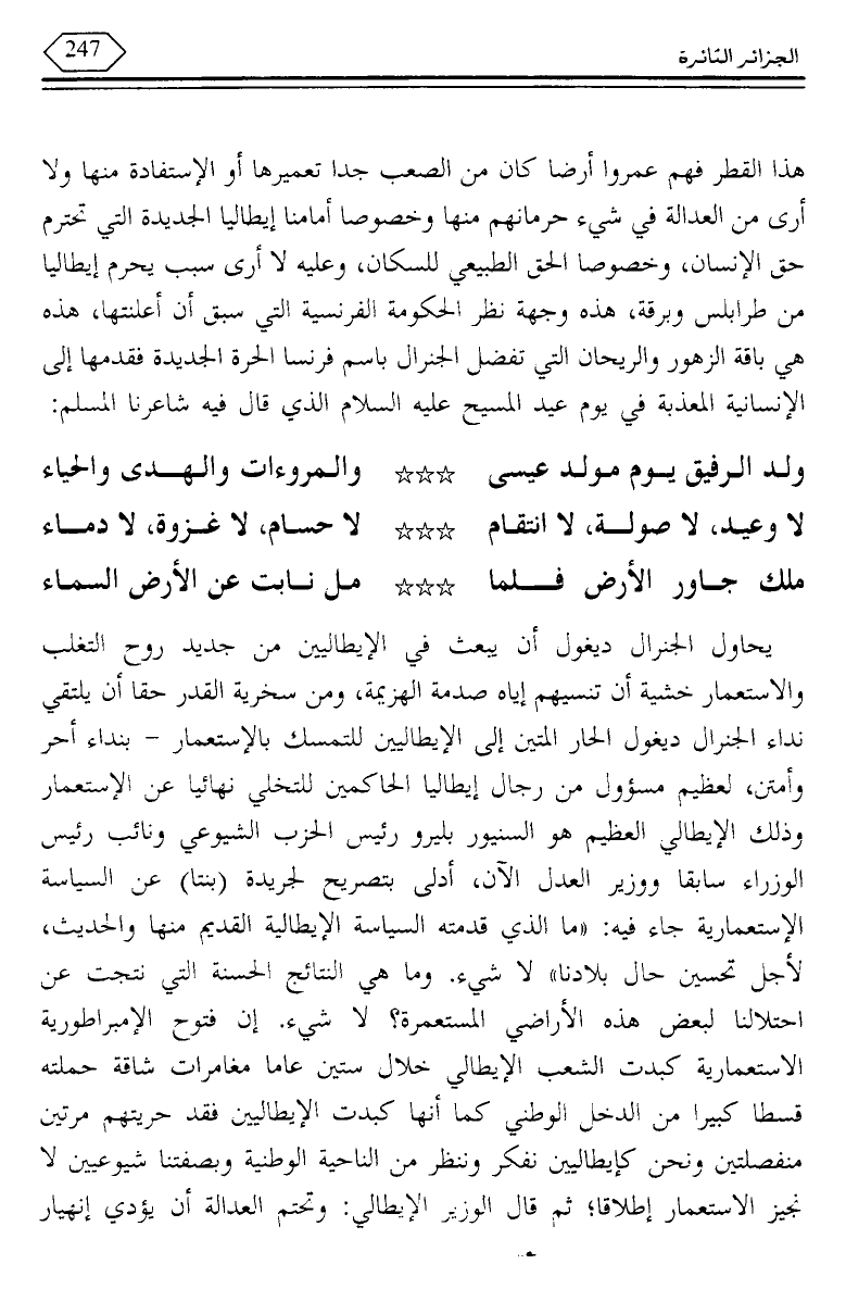 هذا القطر فهم عمروا أرضا كان من الصعب جدا تعميرها أو الاستفادة منها ولا أرى من العدالة في شيء حرمانهم منها وخصوصا أمامنا إيطاليا الجديدة التي تحرم حق الإنسان، وخصوصا الحق الطبيعي للسكان، وعليه لا أرى سبب يحرم إيطاليا من طرابلس وبرقة، هذه وجهة نظر الحكومة الفرنسية التي سبق أن أعلنتها، هذه هي باقة الزهور والريحان التي تفضل الجنرال باسم فرنسا الحرة الجديدة فقدمها إلى الإنسانية المعذبة في يوم عيد المسيح عليه السلام الذي قال فيه شاعرنا المسلم: