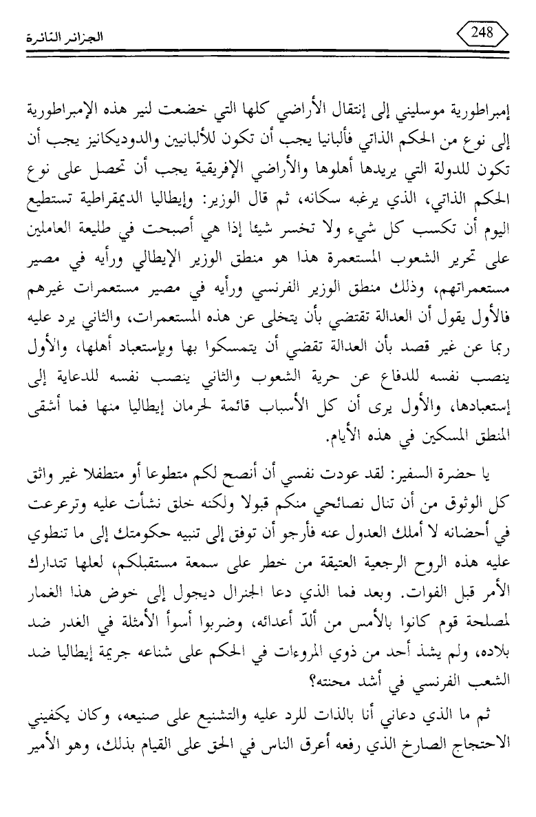 يا حضرة السفير: لقد عودت نفسي أن أنصح لكم متطوعا أو متطفلا غير واثق كل الوثوق من أن تنال نصائحي منكم قبولا ولكنه خلق نشأت عليه وترعرعت في أحضانه لا أملك العدول عنه فأرجو أن توفق إلى تنبيه حكومتك إلى ما تنطوي عليه هذه الروح الرجعية العتيقة من خطر على سمعة مستقبلكم، لعلها تتدارك الأمر قبل الفوات. وبعد فما الذي دعا الجنرال ديجول إلى خوض هذا الغمار لمصلحة قوم كانوا بالأمس من ألد أعدائه، وضربوا أسوأ الأمثلة في الغدر ضد بلاده، ولم يشذ أحد من ذوي المروءات في الحكم على شناعة جريمة إيطاليا ضد الشعب الفرنسي في أشد محنته؟