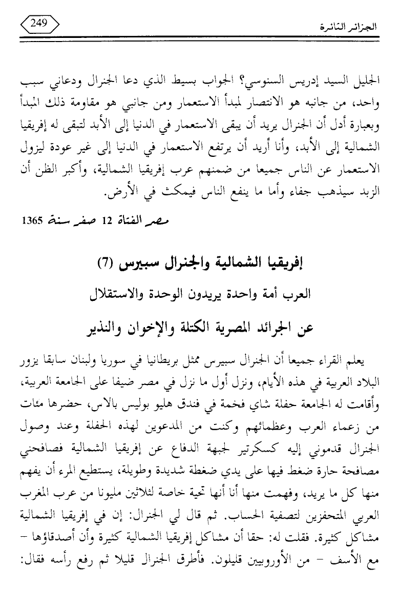 الجليل السيد إدريس السنوسي؟ الجواب بسيط الذي دعا الجنرال ودعاني سبب واحد، من جانبه هو الانتصار لمبدأ الاستعمار ومن جانبي هو مقاومة ذلك المبدأ وبعبارة أدل أن الجنرال يريد أن يبقى الاستعمار في الدنيا إلى الأبد لتبقى له إفريقيا الشمالية إلى الأبد، وأنا أريد أن يرتفع الاستعمار في الدنيا إلى غير عودة ليزول الاستعمار عن الناس جميعا من ضمنهم عرب إفريقيا الشمالية، وأكبر الظن أن الزبد سيذهب جفاء وأما ما ينفع الناس فيمكث في الأرض.