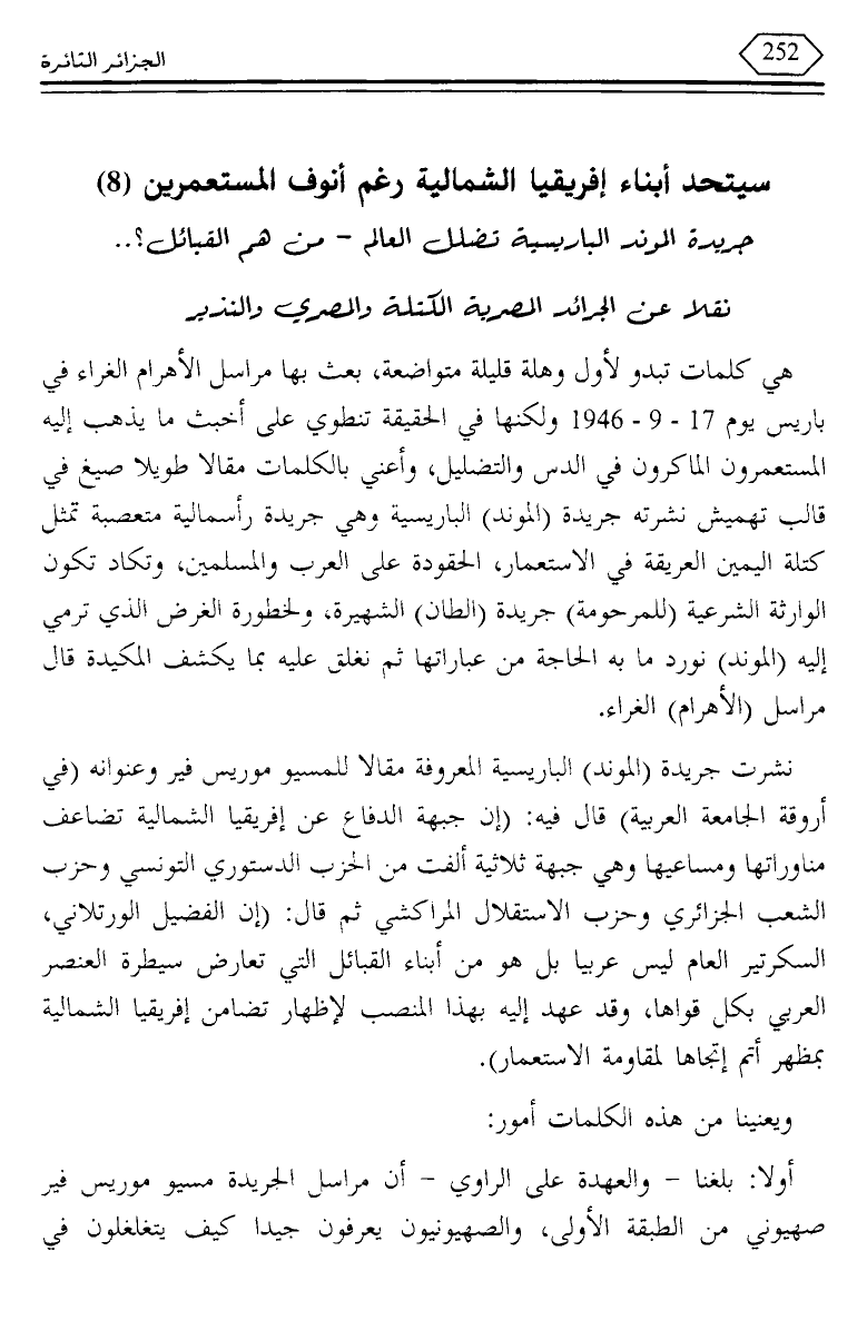 هي كلمات تبدو لأول وهلة قليلة متواضعة، بعث بها مراسل الأهرام الغراء في باريس يوم 17 - 9 - 1946 ولكنها في الحقيقة تنطوي على أخبث ما يذهب إليه المستعمرون الماكرون في الدس والتضليل، وأعني بالكلمات مقالا طويلا صيغ في قال تهميش نشرته جريدة (الموند) الباريسية وهي جريدة رأسمالية متعصبة تمثل كتلة اليمين العريقة في الاستعمار، الحقودة على العرب والمسلمين، وتكاد تكون الوارثة الشرعية (للمرحومة) جريدة (الطان) الشهيرة، ولخطورة الغرض الذي ترمي إليه (الموند) نورد ما به الحاجة من عباراتها ثم نغلق عليه بما يكشف المكيدة قال مراسل (الأهرام) الغراء.