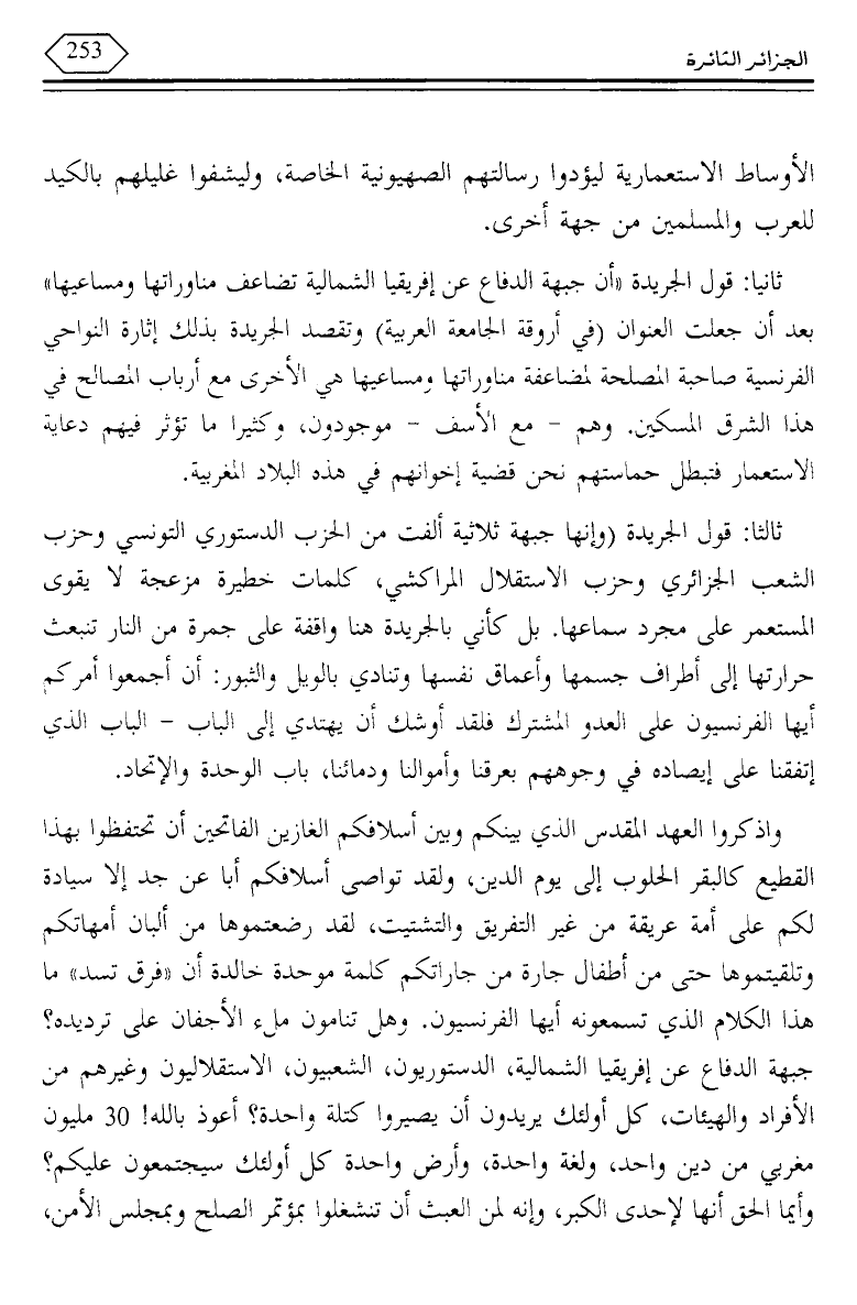 واذكروا العهد المقدس الذي بينكم وبين أسلافكم الغازين الفاتحين أن تحتفظوا بهذا القطيع كالبقر الحلوب إلى يوم الدين، ولقد تواصى أسلافكم أبا عن جد إلا سيادة لكم على أمة عريقة من غير التفريق والتشتيت، لقد رضعتموها من ألبان أمهاتكم وتلقيتموها حتى من أطفال جارة من جاراتكم كلمة موحدة خالدة أن "فرق تسد" ما هذا الكلام الذي تسمعونه أيها الفرنسيون. وهل تنامون ملء الأجفان على ترديده؟ جبهة الدفاع عن إفريقيا الشمالية، الدستوريون، الشعبيون، الاستقلاليون وغيرهم من الأفراد والهيئات، كل أولئك يريدون أن يصيروا كتلة واحدة؟ أعوذ بالله! 30 مليون مغربي من دين واحد، ولغة واحدة، وأرض واحدة كل أولئك سيجتمعون عليكم؟ وأيما الحق أنها لإحدى الكبر، وإنه لمن العبث أن تنشغلوا بمؤتمر الصلح وبمجلس الأمن،