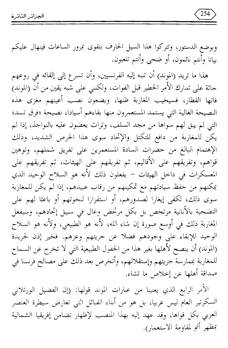 هذا ما تريد (الموند) أن تنبه إليه الفرنسيين، وأن تسرع إلى إلقائه في روعهم حاثة على تدارك الأمر الخطير قبل الفوات، ولكنني على شبه يقين من أن (الموند) فاتها القطار، فسيخيب المغاربة ظنها، ويضعون نصب أعينهم مغزى هذه النصيحة الغالية التي يستمد المستعمرون منها بقاءهم أسيادا، نصيحة "فرق تسد" التي لم يبق لهم سواها من مجد السلف، وتراث يعضون عليه بالنواجذ، إذا لم يكن للمغاربة من دافع للتكتل والاتحاد سوى هذا الحرص الشديد، وذلك الاهتمام البالغ من حضرات السادة المستعمرين على تفريق شملهم، وتوهين قواهم، وتفريقهم على الأقاليم، ثم تفريقهم على الهيئات، ثم تفريقهم على المعسكرات في داخل الهيئات - يفعلون ذلك لأنه هو السلاح الوحيد الذي يمكنهم من حفظ سيادتهم مع تمكينهم من رقاب عبيدهم، إذا لم يكن للمغاربة سوى ذلك، لكفي إيغارا لصدورهم، أو استفزازا لنخوتهم أو باعثا لهم على التضحية بالأنانية مرتخص بل بكل مرتحض وغال في سبيل إتحادهم، وسيفعل المغاربة ذلك في أوسع صورة إن شاء الله، لأنه هو الطبيعي، ولأنه هو السلاح الوحيد للإبقاء على وجودهم فضلا عن حريتهم وعزهم. فخير إذن لجريدة (الموند) أن ينصح لأهلها بغير هذا من الحفول الطبيعية التي لا تخرج عن السماح للمغاربة بممارسة حريتهم واستقلالهم، وأتخرص بعد ذلك على مصالح فرنسا في صداقة أهلها عن إخلاص ما تشاء.