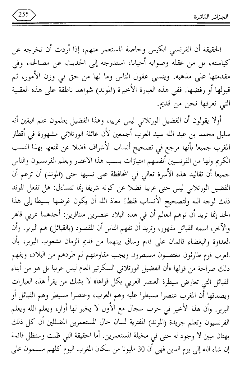 أولا يقولون أن الفضيل الورتلاني ليس عربيا، وهذا الفضيل يعلمون علم اليقين أنه سليل محمد بن عبد الله سيد العرب أجمعين لأن عائلة الورتلاني مشهورة في أقطار المغرب جميعا بأنها مرجع في تصحيح أنساب الأشراف فضلا عن تمتعها بهذا النسب الكريم ولها من الفرنسيين أنفسهم امتيازات، بسبب هذا الاعتبار ويعلم الفرنسيون والناس جميعا أن تقاليد هذه الأسرة تغالي في المحافظة على نسبها حتى (الموند) أن تزعم أن الفضل الورتلاني ليس حتى عربيا فضلا عن كونه شريفا إنما تتساءل: هل تفعل الموند ذلك لوجه الله ولتصحيح الأنساب فقط! معاذ الله أن يكون غرضها بسيطا إلى هذا الحد إنما تريد أن توهم العالم أن في هذه البلاد عنصرين متنافرين: أحدهما عربي قاهر والآخر اسمه القبائل مقهور، وتريد أن تفهم الناس أن المقصود (بالقبائل) هم البربر. وأن العداوة والبغضاء قائمان على قدم وساق بينهما من قديم الزمان لشعوب البربر، بأن العرب قوم طارئون مغتصبون مسيطرون ويجب مقاومتهم ثم طردهم من البلاد، ويفهم ذلك صراحة من قولها "أن الفضيل الورتلاني السكرتير العام ليس عربيا بل هو من أبناء القبائل التي تعارض سيطرة العنصر العربي بكل قواها" لا يشك من يقرأ هذه العبارات ويصدقها أن المغرب عنصرا مسيطرا عليه وهم العرب، وعنصرا مسيطر وهم القبائل أو البربر. وأن هذا الأخير في حرب سجال مع الأول لا يخبو لها أوار، ويعلم الله ويعلم الفرنسيون وتعلم جريدة (الموند) المفترية لسان حال المستعمرين المضللين أن كل ذلك بهتان مبين لا وجود له حتى في مخيلة المستعمرين. أما الحقيقة التي ظلت وستظل قائمة إن شاء الله إلى يوم الدين فهي أن 30 مليونا من سكان المغرب اليوم كلهم مسلمون على