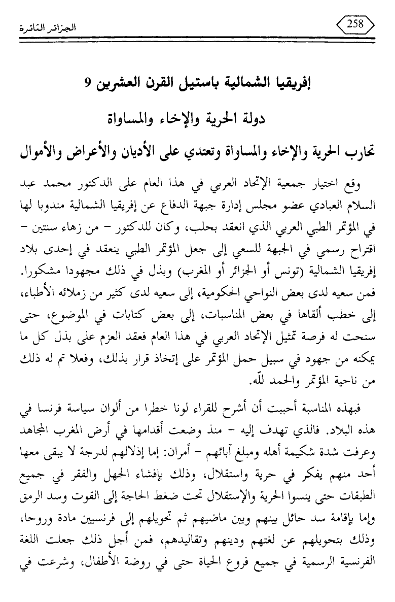 فبهذه المناسبة أحببت أن أشرح للقراء لونا خطرا من ألوان سياسة فرنسا في هذه البلاد. فالذي تهدف إليه - منذ وضعت أقدامها في أرض المغرب المجاهد وعرفت شدة شكيمة أهله ومبلغ آبائهم - أمران: إما إذلالهم لدرجة لا يبقى معها أحد عنهم يفكر في حرية واستقلال، وذلك بإفشاء الجهل والفقر في جميع الطبقات حتى ينسوا الحرية والاستقلال تحت ضغط الحاجة إلى القوت وسد الرمق وإما بإقامة سد حائل بينهم وبين ماضيهم ثم تحويلهم إلى فرنسيين مادة وروحا، وذلك بتحويلهم عن لغتهم ودينهم وتقاليدهم، فمن أجل ذلك جعلت اللغة الفرنسية الرسمية في جميع فروع الحياة حتى في روضة الأطفال، وشرعت في