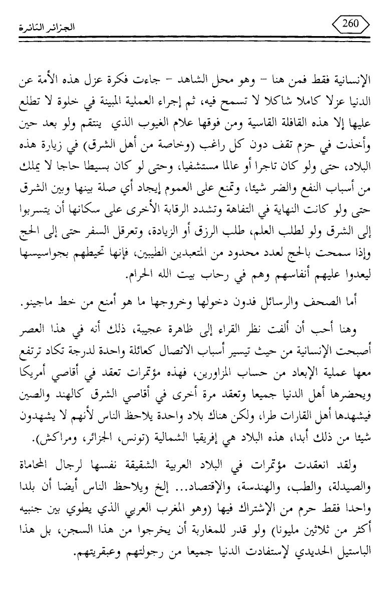 وهنا أحب أن ألفت نظر القراء إلى ظاهرة عجيبة، ذلك أنه في هذا العصر أصبحت الإنسانية من حيث تيسير أسباب الاتصال كعائلة واحدة لدرجة تكاد ترتفع معها عملية الإبعاد من حساب المزاورين، فهذه مؤتمرات تعقد في أقاصي أمريكا ويحضرها أهل الدنيا جميعا وتعقد مرة أخرى في أقاصي الشرق كالهند والصين فيشهدها أهل القارات طرا، ولكن هناك بلاد واحدة يلاحظ الناس لأنهم لا يشهدون شيئا من ذلك أبدا، هذه البلاد هي إفريقيا الشمالية (تونس، الجزائر، ومراكش).