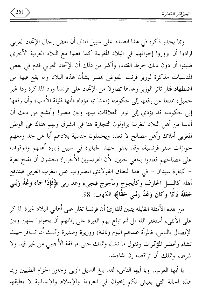 ومما يجدر ذكره في هذا الصدد على سبيل المثال أن بعض رجال الإتحاد العربي أرادوا أن يزوروا إخوانهم في البلاد المغربية كما فعلوا مع البلاد العربية الأخرى فتبينوا أن دون ذلك خرط القتاد، وأكبر من ذلك أن الإتحاد العربي قدم في بعض المناسبات مذكرة لوزير فرنسا المفوض بمصر بشأن هذه البلاد وما يقع فيها من اضطهاد فثار ثائر الوزير وعدها تطاولا من الإتحاد على فرنسا ورد المذكرة ردا غير جميل، ممتنعا عن رفعها إلى حكومته زاعما بما مؤداه "أنها قليلة الأدب" وأن رفعها إلى حكومته قد يؤدي إلى توتر العلاقات بينها وبين مصر! وأبشع من ذلك أن أناسا من أهل البلاد المغربية يزاولون التجارة هنا في الشرق ولهم هناك في الوطن المغربي أملاك وأهل مصالح لا تعد، ويحملون جنسية بلادهم أبا عن جد ومعهم جوازات سفر فرنسية، وقد بذلوا جهد الجبابرة في سبيل زيارة أهلهم والوقوف على مصالحهم فعادوا بخفي حنين، لأن الفرنسيين الأحرار؟ يخشون أن تفتح ثغرة - كثغرة سيدان - في هذا النطاق الفولاذي المضروب على المغرب العربي فيندفع أهله كالسيل الجارف وكيأجوج ومأجوج فيجيء وعد ربي {فإذا جاء وعد ربي جعله دكا وكان وعد ربي حقا} الكهف: 98.