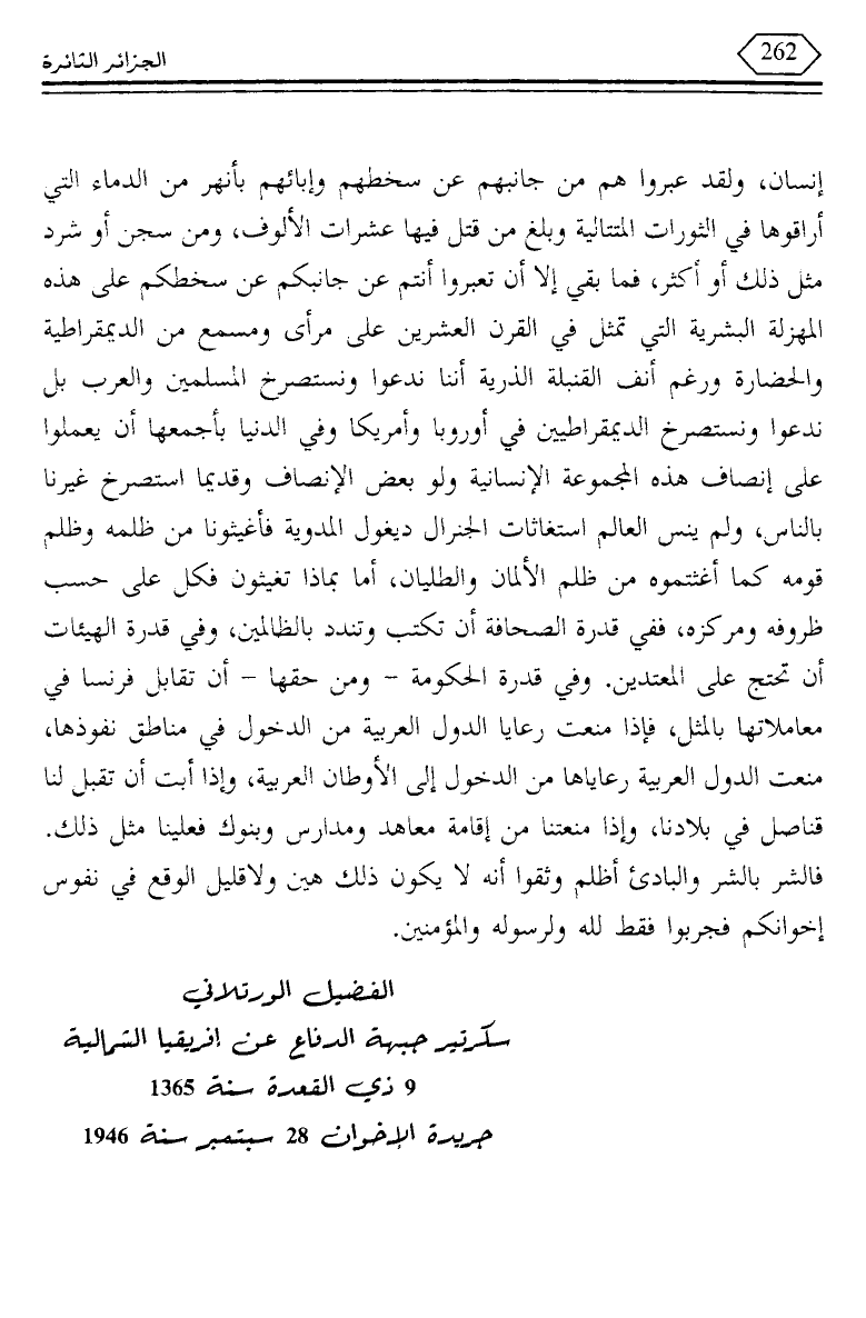 إنسان، ولقد عبروا هم من جانبهم عن سخطهم وإبائهم بأنهر من الدماء التي أراقوها في الثورات المتتالية وبلغ من قتل فيها عشرات الألوف، ومن سحن أو شرد مثل ذلك أو أكثر، فما بقي إلا أن تعبروا أنتم عن جانبكم عن سخطكم على هذه المهزلة البشرية التي تمثل في القرن العشرين على مرأى ومسمع من الديمقراطية والحضارة ورغم أنف القنبلة الذرية أننا ندعوا ونستصرخ المسلمين والعرب بل ندعوا ونستصرخ الديمقراطيين في أوروبا وأمريكا وفي الدنيا بأجمعها أن يعملوا على إنصاف هذه المجموعة الإنسانية ولو بعض الإنصاف وقديما استصرخ غيرنا بالناس، ولم ينس العالم استغاثات الجنرال ديغول المدوية فأغيثونا من ظلمه وظلم قومه كما أغثتموه من ظلم الألمان والطليان، أما بماذا تغيثون فكل على حسب ظروفه ومركزه، ففي قدرة الصحافة أن تكتب وتندد بالظالمين، وفي قدرة الهيئات أن تحتج على المعتدين. وفي قدرة الحكومة - ومن حقها - أن تقابل فرنسا في معاملاتها بالمثل، فإذا منعت رعايا الدول العربية من الدخول في مناطق نفوذها، منعت الدول العربية رعاياها من الدخول إلى الأوطان العربية، وإذا أبت أن تقبل لنا قناصل في بلادنا، وإذا منعتنا من إقامة معاهد ومدارس وبنوك فعلينا مثل ذلك. فالشر بالشر والبادئ أظلم وثقوا أنه لا يكون ذلك هين ولا قليل الوقع في نفوس إخوانكم فجربوا فقط لله ولرسوله والمؤمنين.