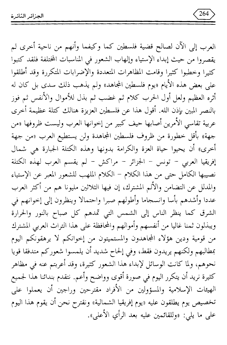العرب إلى الآن لصالح قضية فلسطين كما وكيفا وأنهم من ناحية أخرى لم يقصروا من حيث إبداء الاستياء وإلهاب الشعور في المناسبات المختلفة فلقد كتبوا كثيرا وخطبوا كثيرا وقامت المظاهرات المتعددة والإضرابات المتكررة وقد أطلقوا على بعض هذه الأيام "يوم فلسطين المجاهد" ولم يذهب ذلك سدى بل كان له أثره العظيم ولعل أول الحرب كلام ثم غضب ثم بذل للأموال والأنفس ثم فوز بالنصر المبين بإذن الله. أقول هذا عن فلسطين العزيزة هناك كتلة عظيمة أخرى عربية تقاسي الأمرين أصابها حيف كبير من إخوانها العرب وليست ظروفها "من جهة" بأقل خطورة من ظروف فلسطين المجاهدة ولن يستطيع العرب "من جهة أخرى" أن يحيوا حياة العزة والكرامة بدونها وهذه الكتلة الجبارة هي شمال إفريقيا العربي - تونس - الجزائر - مراكش - لم يقسم العرب لهذه الكتلة نصيبها الكامل حتى من هذا الكلام - الكلام الملهب للشعور المعبر عن الاستياء والمدلل عن التضامن والألم المشترك، إن فيها الثلاثين مليونا هم من أكثر العرب عددا وأشدهم بأسا وانسجاما وأطولهم صبرا واحتمالا وينظرون إلى إخوانهم في الشرق كما ينظر الناس إلى الشمس التي تمدهم كل صباح بالنور والحرارة ويبذلون ثمنا غاليا من أنفسهم وأموالهم والمحافظة على هذا التراث العربي المشترك من قومية ودين هؤلاء المجاهدون والمستميتون من إخوانكم لا يرهقونكم اليوم بمطالبهم ولكنهم يريدون فقط، وفي إلحاح شديد أن يلمسوا شعوركم متدفقا قويا نحوهم، ولما كانت الوسائل لإبداء هذا الشعور كثيرة، وقد أعربتم عنه في مظاهر كثيرة نريد أن يتكرر اليوم في صورة أقوى وواضح وأعم. نتقدم بندائنا هذا لجميع الهيئات الإسلامية والمسؤولين من الأفراد مقترحين وراجين أن يعملوا على تخصيص يوم يطلقون عليه "يوم إفريقيا الشمالية" ونقترح نحن أن يقوم هذا اليوم على ما يلي: "وللقائمين عليه بعد الرأي الأعلى".