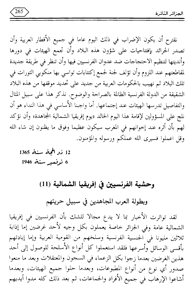 لقد تواترت الأخبار بما لا يدع مجالا للشك بأن الفرنسيين في إفريقيا الشمالية عامة وفي الجزائر خاصة يعملون بكل وجيه لأحد غرضين إما إذابة ثلاثين مليونا في الجنسية الفرنسية وسلخهم من القومية العربية وإما إبادتهم بأقسى الوسائل وأسرعها فلقد استعملوا كل أنواع الأسلحة للوصول إلى أحد هذين الغرضين بعدما زجوا بكل الزعماء في السجون والمعتقلات وبعد ما منعوا صدور أي نوع من أنواع المطبوعات، وبعدما حلوا جميع الهيئات، وبعدما أشاعوا الإرهاب في جميع الأفراد والجماعات، ثم بعد ذلك كله مدوا أيديهم