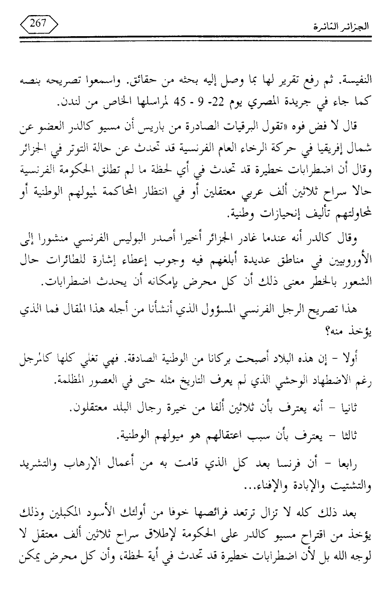 قال لا فض فوه "تقول البرقيات الصادرة من باريس أن مسيو كالدر العضو عن شمال إفريقيا في حركة الرخاء العام الفرنسية قد تحدث عن حالة التوتر في الجزائر وقال أن اضطرابات خطيرة قد تحدث في أي لحظة ما لم تطلق الحكومة الفرنسية حالا سراح ثلاثين ألف عربي معتقلين أو في انتظار المحاكمة لميولهم الوطنية أو محاولتهم تأليف إنحيازات وطنية.