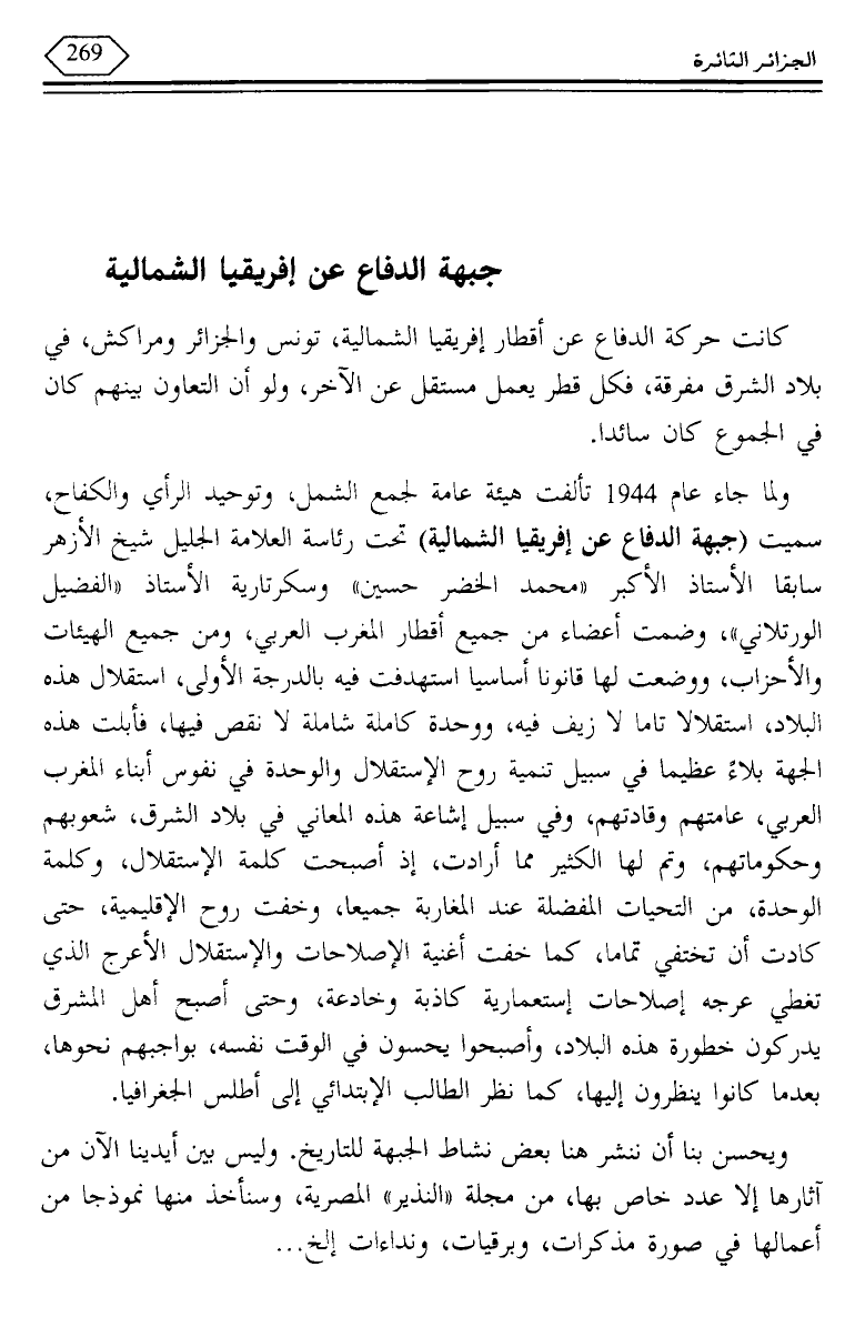 ولما جاء عام 1944 تألفت هيئة عامة لجمع الشمل، وتوحيد الرأي والكفاح، سميت (جبهة الدفاع عن إفريقيا الشمالية) تحت رئاسة العلامة الجليل شيخ الأزهر سابقا الأستاذ الأكبر "محمد الخضر حسين" وسكرتارية الأستاذ "الفضيل الورتلاني"، وضمت أعضاء من جميع أقطار المغرب العربي، ومن جميع الهيئات والأحزاب، ووضعت لها قانونا أساسيا استهدفت فيه بالدرجة الأولى، استقلال هذه البلاد، استقلالا تاما لا زيف فيه، ووحدة كاملة شاملة لا نقص فيها، فأبلت هذه الجهة بلاء عظيما في سبيل تنمية روح الاستقلال والوحدة في نفوس أبناء المغرب العربي، عامتهم وقادتهم، وفي سبيل إشاعة هذه المعاني في بلاد الشرق، شعوبهم وحكوماتهم، وتم لها الكثير مما أرادت، إذ أصبحت كلمة الاستقلال، وكلمة الوحدة، من التحيات المفضلة عند المغاربة جميعا، وخفت روح الإقليمية، حتى كادت أن تختفي تماما، كما خفت أغنية الإصلاحات والاستقلال الأعرج الذي تغطي عرجه إصلاحات إستعمارية كاذبة وخادعة، وحتى أصبح أهل المشرق يدركون خطورة هذه البلاد، وأصبحوا يحسون في الوقت نفسه، بواجبهم نحوها، بعدما كانوا ينظرون إليها، كما نظر الطالب الإبتدائي إلى أطلس الجغرافيا.