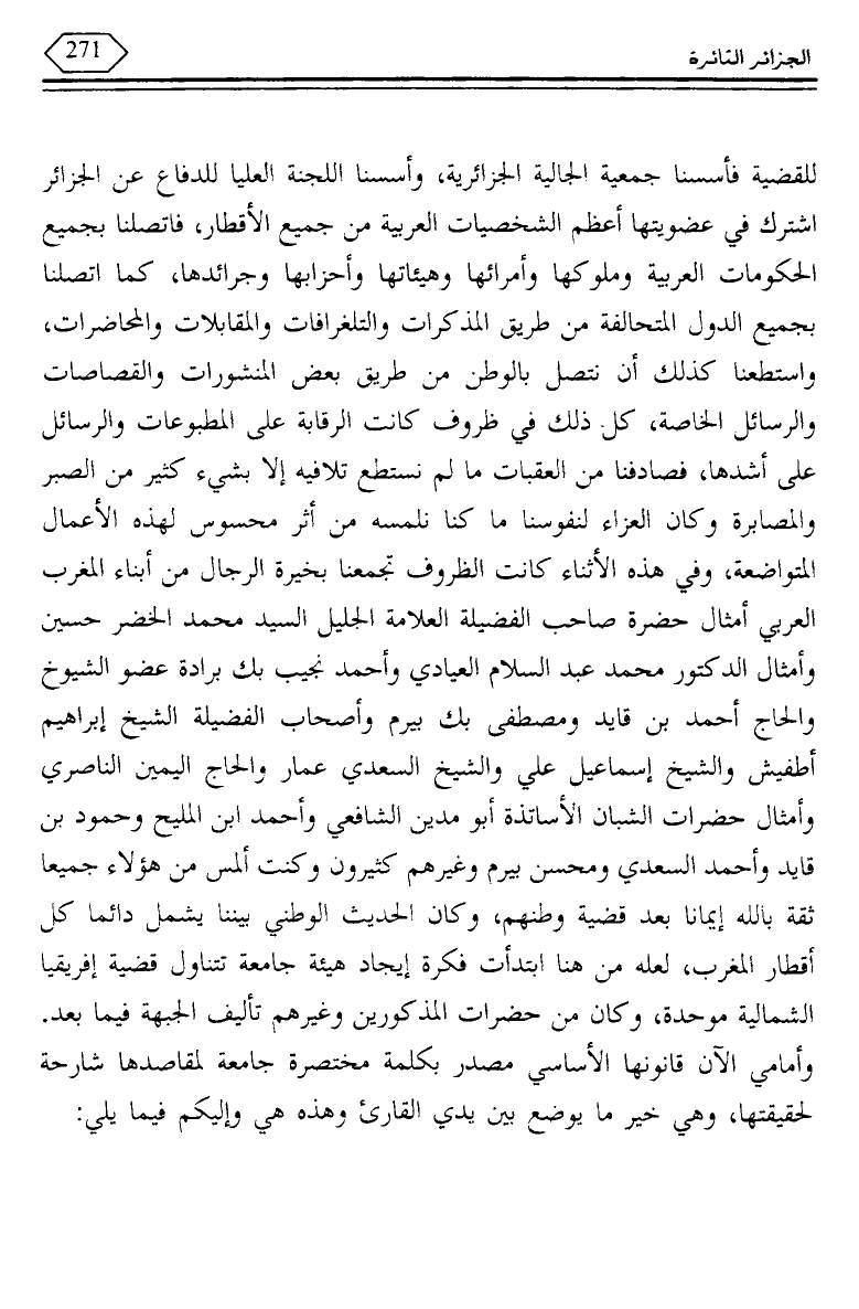 للقضية فأسسنا جمعية الجالية الجزائرية، وأسسنا اللجنة العليا للدفاع عن الجزائر اشترك في عضويتها أعظم الشخصيات العربية من جميع الأقطار، فاتصلنا بجميع الحكومات العربية وملوكها وأمرائها وهيئاتها وأحزابها وجرائدها، كما اتصلنا بجميع الدول المتحالفة من طريق المذكرات والتلغرافات والمقابلات والمحاضرات، واستطعنا كذلك أن نتصل بالوطن من طريق بعض المنشورات والقصاصات والرسائل الخاصة، كل ذلك في ظروف كانت الرقابة على المطبوعات والرسائل على أشدها، فصادفنا من العقبات ما لم نستطع تلافيه إلا بشيء كثير من الصبر والمصابرة وكان العزاء لنفوسنا ما كنا نلمسه من أثر محسوس لهذه الأعمال المتواضعة، وفي هذه الأثناء كانت الظروف تجمعنا بخيرة الرجال من أبناء المغرب العربي أمثال حضرة صاحب الفضيلة العلامة الجليل السيد محمد الخضر حسين وأمثال الدكتور محمد عبد السلام العيادي وأحمد نجيب بك برادة عضو الشيوخ والحاج أحمد بن قايد ومصطفي بك بيرم وأصحاب الفضيلة الشيخ إبراهيم أطفيش والشيخ إسماعيل علي والشيخ السعدي عمار والحاج اليمين الناصري وأمثال حضرات الشبان الأساتذة أبو مدين الشافعي وأحمد ابن المليح وحمود بن قايد وأحمد السعدي ومحسن بيرم وغيرهم كثيرون وكنت ألمس من هؤلاء جميعا ثقة بالله إيمانا بعد قضية وطنهم، وكان الحديث، الوطني بيننا يشمل دائما كل أقطار المغرب، لعله من هنا ابتدأت فكرة إيجاد هيئة جامعة تتناول قضية إفريقيا الشمالية موحدة، وكان من حضرات المذكورين وغيرهم تأليف الجبهة فيما بعد.