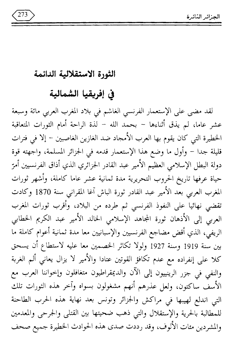 لقد مضى على الاستعمار الفرنسي الغاشم في بلاد المغرب العربي مائة وسبعة عشر عاما، لم يذق أثناءها - بحمد الله - لذة الراحة أمام الثورات المتعاقبة الخطيرة التي كان يقوم بها العرب الأمجاد ضد الغازين الغاصبين - إلا في فترات قليلة جدا - وأول ما وضع هذا الاستعمار قدمه في الجزائر المسلمة، واجهته قوة دولة البطل الإسلامي العظيم الأمير عبد القادر الجزائري الذي أذاق الفرنسيين أمر حياة عرفها تاريخ الحروب التحريرية مدة ثمانية عشر عاما كاملة، وأشهر ثورات المغرب العربي بعد الأمير عبد القادر ثورة الباش آغا المقراني سنة 1870 وكادت تقضى نهائيا على النفوذ الفرنسي ثم طرده من البلاد، وأقرب ثورات المغرب العربي إلى الأذهان ثورة المجاهد الإسلامي الخالد الأمير عبد الكريم الخطابي الريفي، الذي أقض مضاجع الفرنسيين والإسبانيين معا مدة ثمانية أعوام كاملة ما بين سنة 1919 وسنة 1927 ولولا تكاثر الخصمين معا عليه لاستطاع أن يسحق كلا على إنفراده مع عدم تكافؤ القوتين عتادا والأمير لا يزال يعاني ألم الغربة والنفي في جزر الرينييون إلى الآن والديمقراطيون متغافلون وإخواننا العرب مع الأسف ساكتون، ولعل عذرهم أنهم مشغولون بسواه وآخر هذه الثورات تلك التي اندلع لهيبها في مراكش والجزائر وتونس بعد نهاية هذه الخرب الطاحنة للمطالبة بالحرية والاستقلال والتي ذهب ضحيتها بين القتلى والجرحى والمعدمين والمشربين مئات الألوف، وقد رددت صدى هذه الحوادث الخطيرة جميع صحف