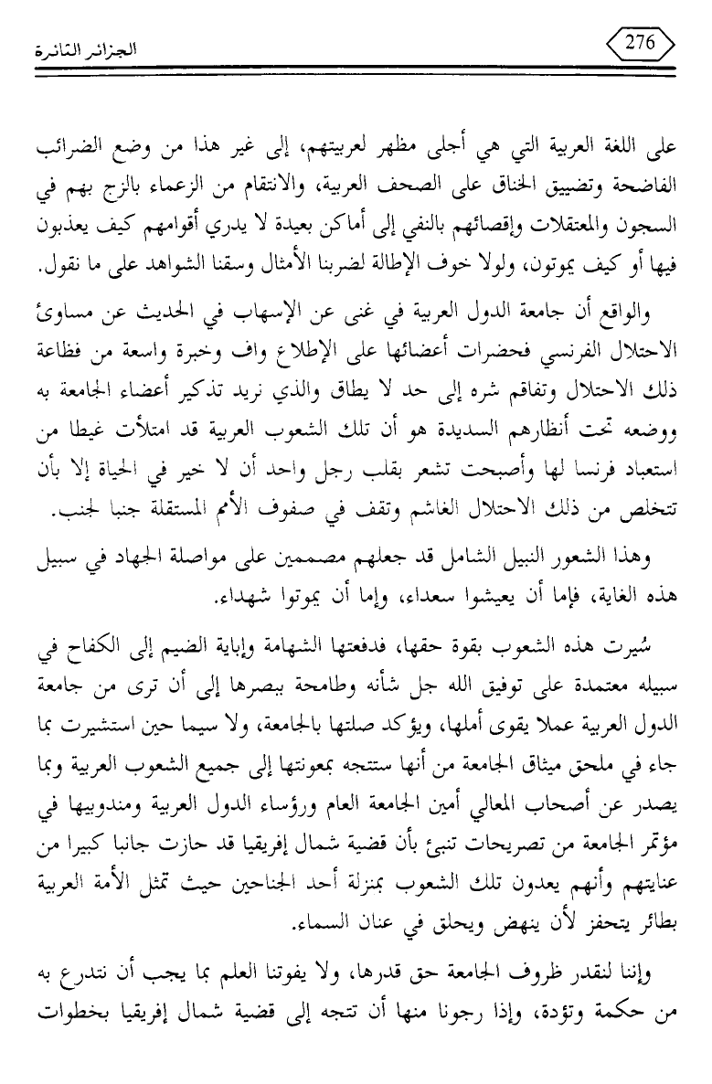 وإننا لنقدر ظروف الجامعة حق قدرها، ولا يفوتنا العلم بما يجب أن نتدرع به من حكمة وتؤدة، وإذا رجونا منها أن تتجه إلى قضية شمال إفريقيا بخطوات