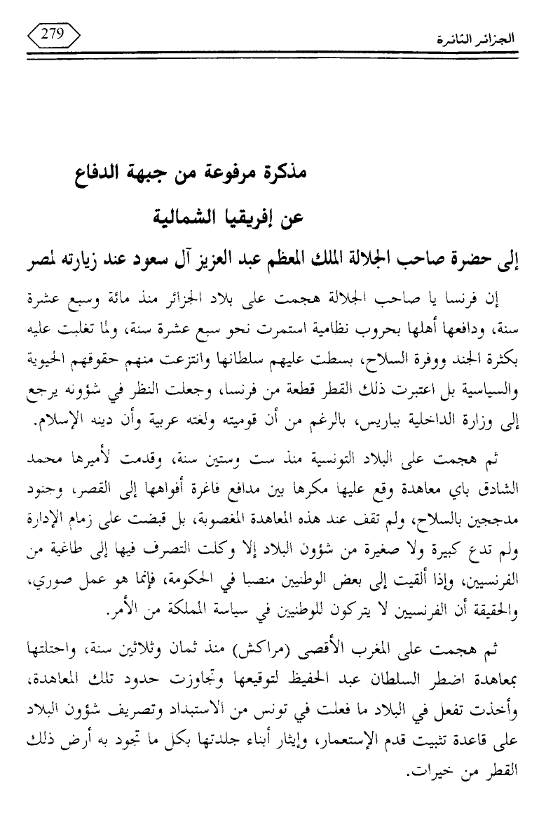 إن فرنسا يا صاحب الجلالة هجمت على بلاد الجزائر منذ مائة وسبع عشرة سنة، ودافعها أهلها بحروب نظامية استمرت نحو سبع عشرة سنة، ولما تغلبت عليه بكثرة الجند ووفرة السلاح، بسطت عليهم سلطانها وانتزعت منهم حقوقهم الحيوية والسياسية بل اعتبرت ذلك القطر قطعة من فرنسا، وجعلت النظر في شؤونه يرجع إلى وزارة الداخلية بباريس، بالرغم من أن قوميته ولغته عربية وأن دينه الإسلام.