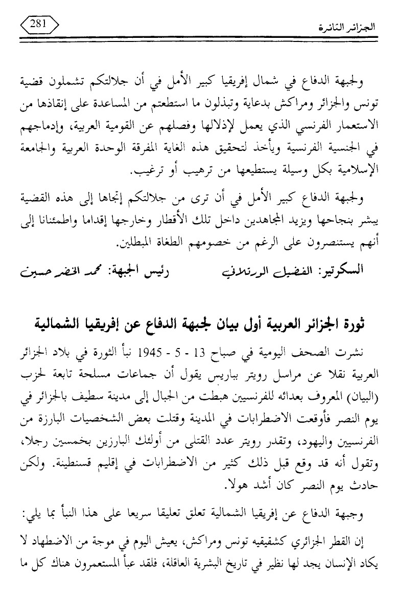 ولجبهة الدفاع في شمال إفريقيا كبير الأمل في أن جلالتكم تشملون قضية تونس والجزائر ومراكش بدعاية وتبذلون ما استطعتم من المساعدة على إنقاذها من الاستعمار الفرنسي الذي يعمل لإذلالها وفصلهم عن القومية العربية، وإدماجهم في الجنسية الفرنسية ويأخذ لتحقيق هذه الغاية المفرقة الوحدة العربية والجامعة الإسلامية بكل وسيلة يستطيعها من ترهيب أو ترغيب.