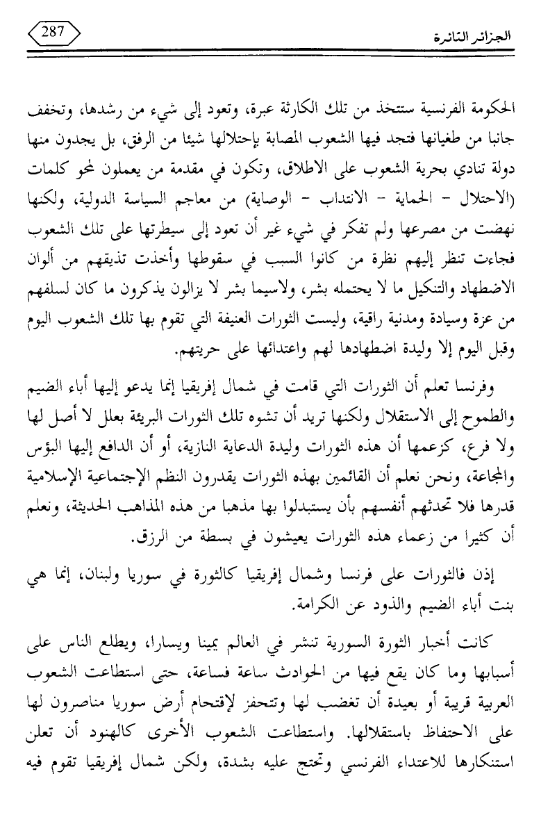 إذن فالثورات على فرنسا وشمال إفريقيا كالثورة في سوريا ولبنان، إنما هي بنت أباء الضيم والذود عن الكرامة.