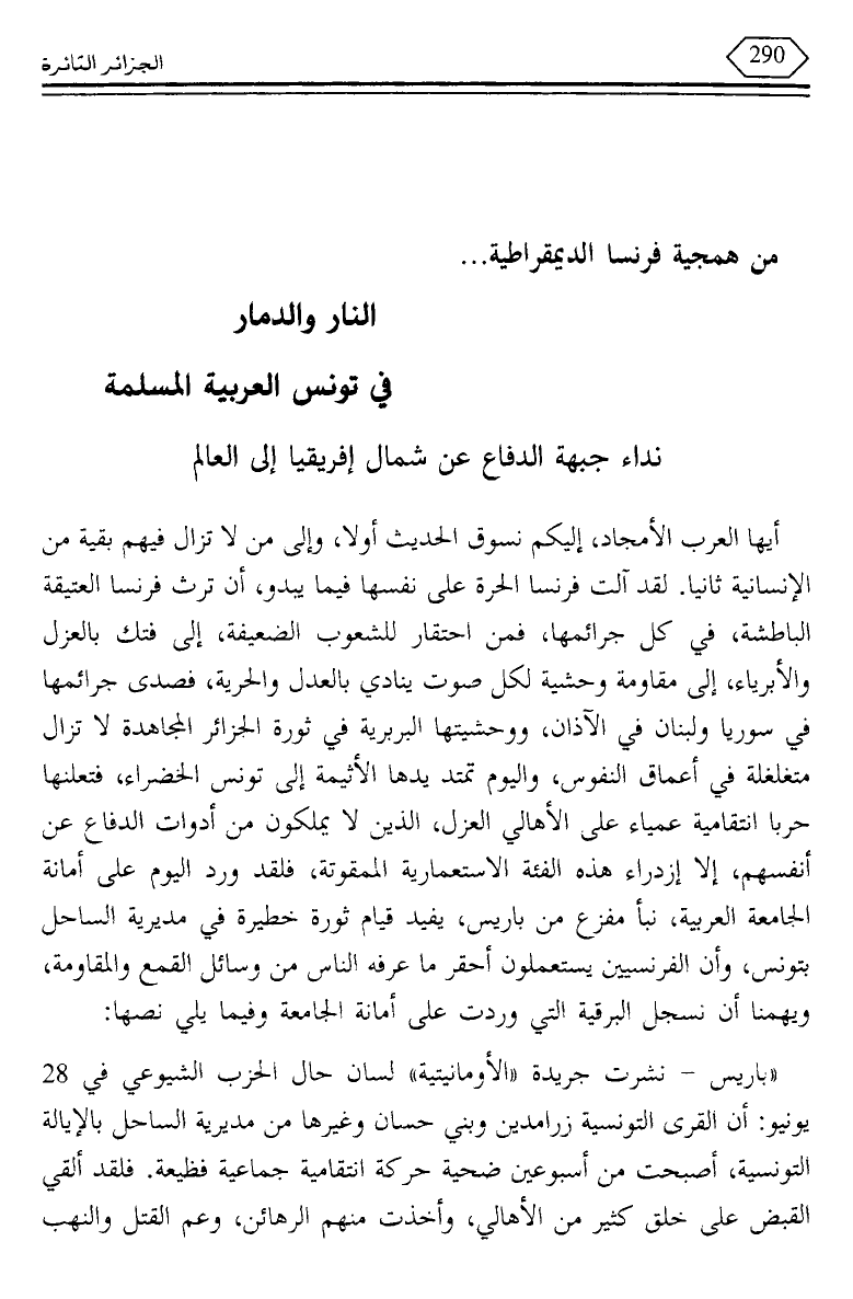 أيها العرب الأمجاد، إليكم نسوق الحديث، أولا، وإلى من لا تزال فيهم بقية من الإنسانية ثانيا. لقد آلت فرنسا الحرة على نفسها فيما يبدو، أن ترث فرنسا العتيقة الباطشة، في كل جرائمها، فمن احتقار للشعوب الضعيفة، إلى فتك بالعزل والأبرياء، إلى مقاومة وحشية لكل صوت ينادي بالعدل والحرية، فصدى جرائمها في سوريا ولبنان في الآذان، ووحشيتها البربرية في ثورة الجزائر المجاهدة لا تزال متغلغلة في أعماق النفوس، واليوم تمتد يدها الأثيمة إلى تونس الخضراء، فتعلنها حربا انتقامية عمياء على الأهالي العزل، الذين لا يملكون من أدوات الدفاع عن أنفسهم، إلا ازدراء هذه الفئة الاستعمارية الممقوتة، فلقد ورد اليوم على أمانة الجامعة العربية، نبأ مفزع من باريس، يفيد قيام ثورة خطيرة في مديرية الساحل بتونس، وأن الفرنسيين يستعملون أحقر ما عرفه الناس من وسائل القمع والمقاومة، ويهمنا أن نسجل البرقية التي وردت على أمانة الجامعة وفيما يلي نصها: