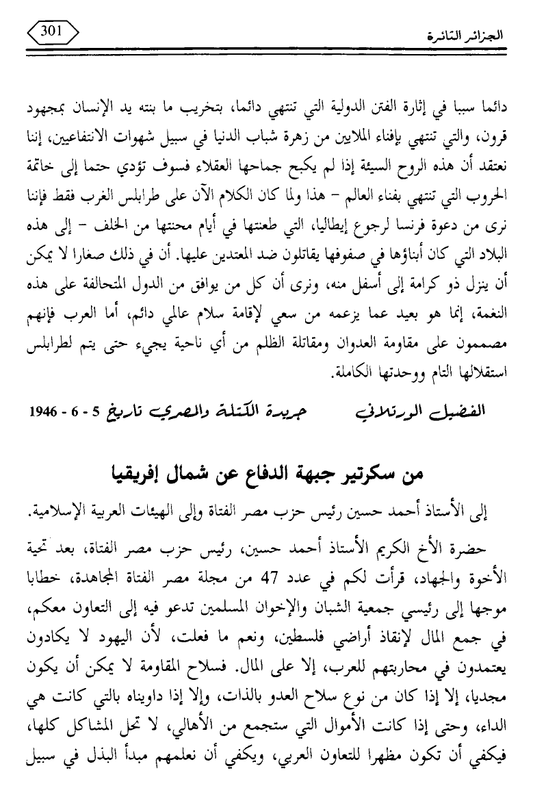 دائما سببا في إثارة الفتن الدولية التي تنتهي دائما، بتخريب ما بنته يد الإنسان بمجهود قرون، والتي تنتهي بإفناء الملايين من زهرة شباب الدنيا في سبيل شهوات الانتفاعيين، إننا نعتقد أن هذه الروح السيئة إذا لم يكبح جماحها العقلاء فسوف تؤدي حتما إلى خاتمة الحروب التي تنتهي بفناء العالم - هذا ولما كان الكلام الآن على طرابلس الغرب فقط فإننا نرى من دعوة فرنسا لرجوع إيطاليا، التي طعنتها في أيام محنتها من الخلف - إلى هذه البلاد التي كان أبناؤها في صفوفها يقاتلون ضد المعتدين عليها. أن في ذلك صغارا لا يمكن أن ينزل ذو كرامة إلى أسفل منه، ونرى أن كل من يوافق من الدول المتحالفة على هذه النغمة، إنما هو بعيد عما يزعمه من سعي لإقامة سلام عالمي دائم، أما العرب فإنهم مصممون على مقاومة العدوان ومقاتلة الظلم من أي ناحية يجيء حتى يتم لطرابلس استقلالها التام ووحدتها الكاملة.