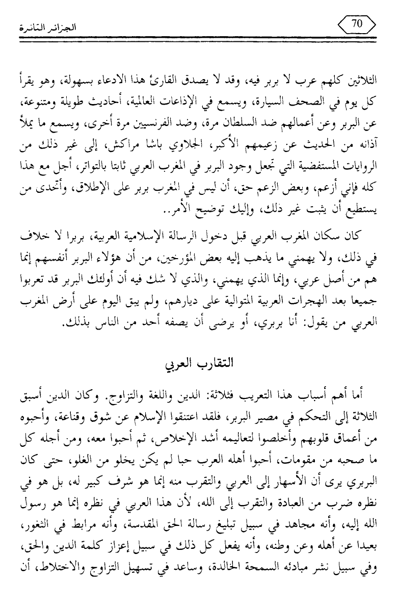 الثلاثين كلهم عرب لا بربر فيه، وقد لا يصدق القارئ هذا الادعاء بسهولة، وهو يقرأ كل يوم في الصحف السيارة، ويسمع في الإذاعات العالمية، أحاديث طويلة ومتنوعة، عن البربر وعن أعمالهم ضد السلطان مرة، وضد الفرنسيين مرة أخرى، ويسمع ما يملأ آذانه من الحديث عن زعيمهم الأكبر، الجلاوي باشا مراكش، إلى غير ذلك من الروايات المستفضية التي تجعل وجود البربر في المغرب العربي ثابتا بالتواتر، أجل مع هذا كله فإني أزعم، وبعض الزعم حق، أن ليس في المغرب بربر على الإطلاق، وأتدى من يستطيع أن يثبت غير ذلك، وإليك توضيح الأمر ..