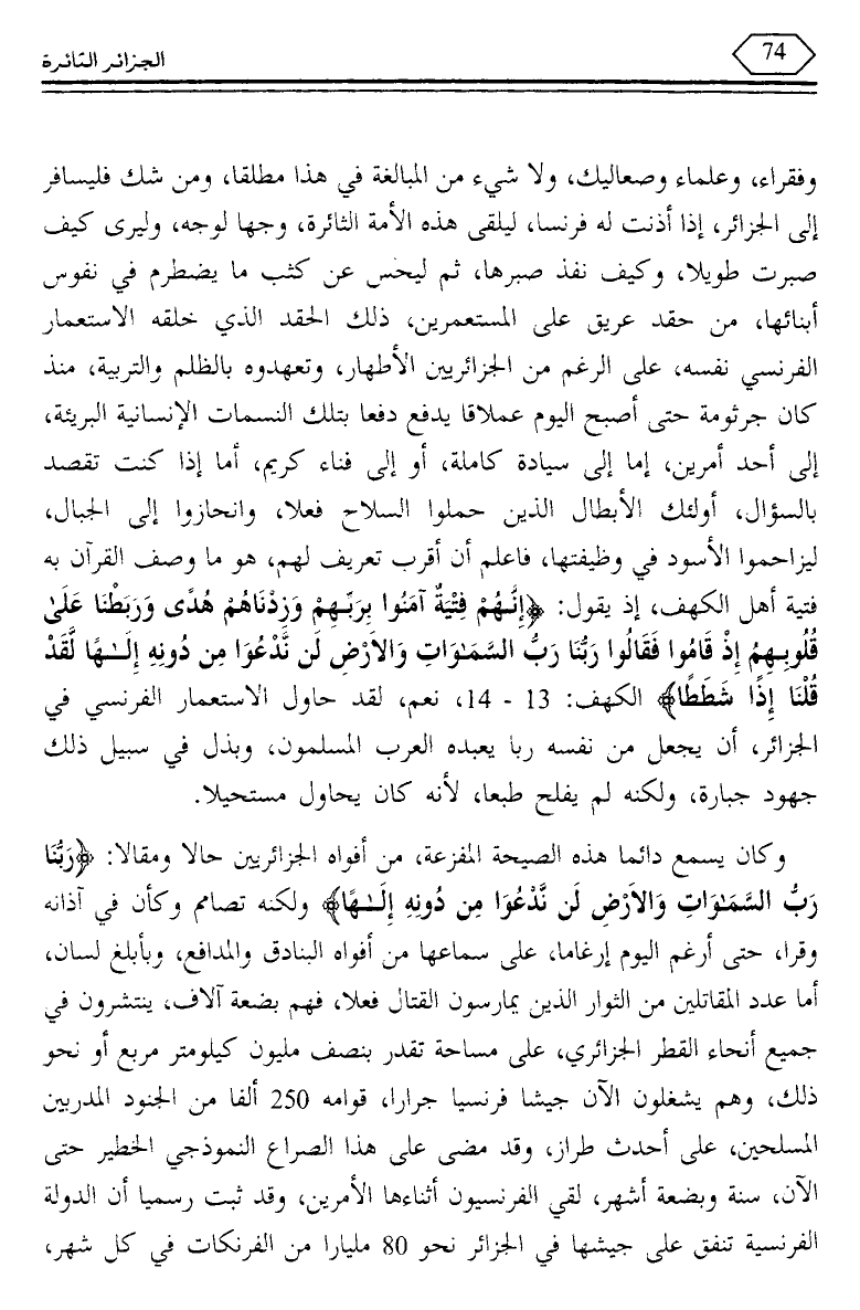 وكان يسمع دائما هذه الصيحة المفزعة، من أفواه الجزائريين حالا ومقالا: {ربنا رب السماوات والارض لن ندعوا من دونه إلها} ولكنه تصامم وكأن في آذانه وقرا، حتى أرغم اليوم إرغاما، على سماعها من أفواه البنادق والمدافع، وبأبلغ لسان، أما عدد المقاتلين من الثوار الذين يمارسون القتال فعلا، فهم بضعة آلاف، ينتشرون في جميع أنحاء القطر الجزائري، على مساحة تقدر بنصف مليون كيلومتر مربع أو نحو ذلك، وهم يشغلون الآن جيشا فرنسيا جرارا، قوامه 250 ألفا من الجنود المدربين المسلحين، على أحدث طراز، وقد مضى على هذا الصراع النموذجى الخطير حتى الآن، سنة وبضعة أشهر، لقي الفرنسيون أثناءها الأمرين، وقد ثبت رسميا أن الدولة الفرنسية تنفق على جيشها في الجزائر نحو 80 مليارا من الفرنكات في كل شهر،