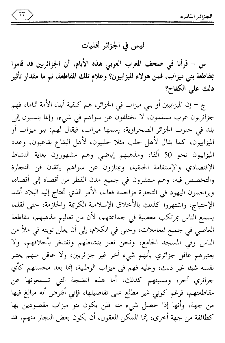 ج - إن الميزابيين أو بني ميزاب في الجزائر، هم كبقية أبناء الأمة تماما، فهم جزائريون عرب مسلمون، لا يختلفون عن سواهم في شيء، وإنما ينسبون إلى بلد في جنوب الجزائر الصحراوية، إسمها ميزاب، فيقال لهم: بنو ميزاب أو الميزابيون، كما يقال لأهل حلب مثلا حلبيون، لأهل البقاع بقاعيون، وعدد الميزابيون نحو 50 ألفا، ومذهبهم إباضي وهم مشهورون بغاية النشاط الاقتصادي والاستقامة الخلقية، ويمتازون عن سواهم بإتقان فن التجارة والتخصص فيه، وهم منتشرون في جميع مدن القطر من أقصاه إلى أقصاه، ويزاحمون اليهود في التجارة مزاحمة فعالة، الأمر الذي تحتاج إليه البلاد أشد الاحتياج، واشتهروا كذلك بالأخلاق الإسلامية الكريمة والحازمة، حتى لقلما يسمع الناس بمرتكب معصية في جماعتهم، لأن من تعاليم مذهبهم، مقاطعة العاصي في جميع المعاملات، وحتى في الكلام، إلى أن يعلن توبته في ملأ من الناس وفي المسجد الجامع، ونحن نعتز بنشاطهم ونفتخر بأخلاقهم، ولا يعتبرهم عاقل جزائري بأنهم شيء آخر غير جزائريين، ولا عاقل منهم يعتبر نفسه شيئا غير ذلك، وعليه فهم في ميزاب الوطنية، إنما يعد محسنهم كأي جزائري آخر، ومسيئهم كذلك، أما هذه الضجة التي تسمعونها عن مقاطعتهم، فرغم كوني غير مطلع على تفاصيلها، فإني أفترض أنه مبالغ فيها من جهة، وأنها إذا حصل شيء منه فلن يكون بنو ميزاب مقصودين بها كطائفة من جهة أخرى، إنما الممكن المعقول، أن يكون بعض التجار منهم، قد