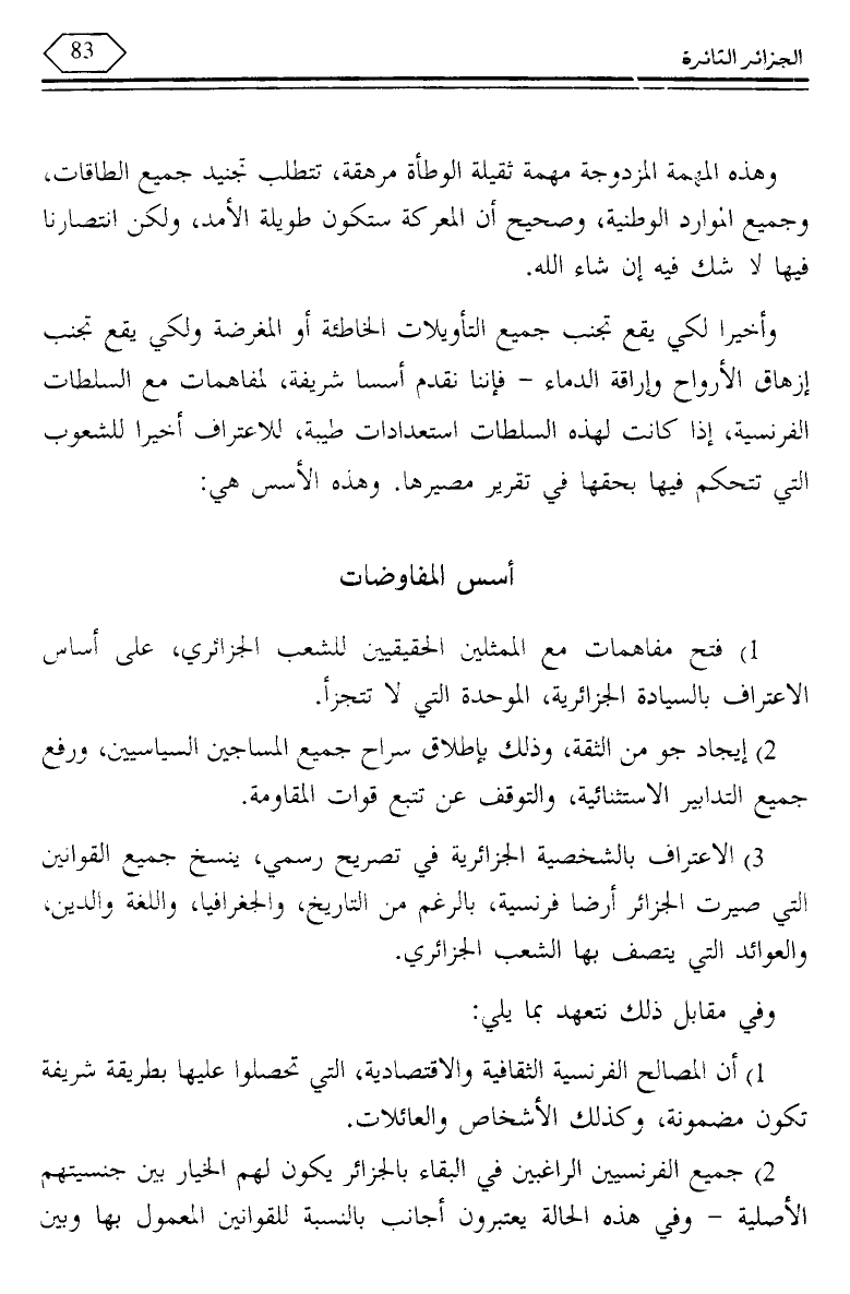 وأخيرا لكي يقع تجنب جميع التأويلات الخاطئة أو المغرضة ولكي يقع تجنب إزهاق الأرواح وإراقة الدماء - فإننا نقدم أسسا شريفة، لمفاهمات مع السلطات الفرنسية، إذا كانت لهذه السلطات استعدادات طيبة، للاعتراف أخيرا للشعوب التي تتحكم فيها بحقها في تقرير مصيرها. وهذه الأسس هي: