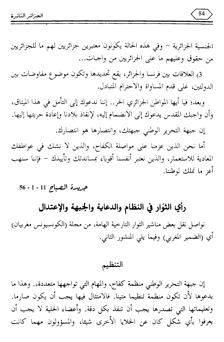 إن جبهة التحرير الوطني منظمة كفاح، والمهام التي تواجهها متعددة، وهذا ما يدعوها لأن تكون منظمة تنظيما متينا. فالامتثال فيها يجب أن يكون صارما. وتعليماتها التي تصدرها يجب أن تنفذ بكل دقة. وأعضاء الخلية لا يجب أن يعرفوا بأي شكل كان عن الخلايا الأخرى شيئا، والمسؤولون مهما كانت