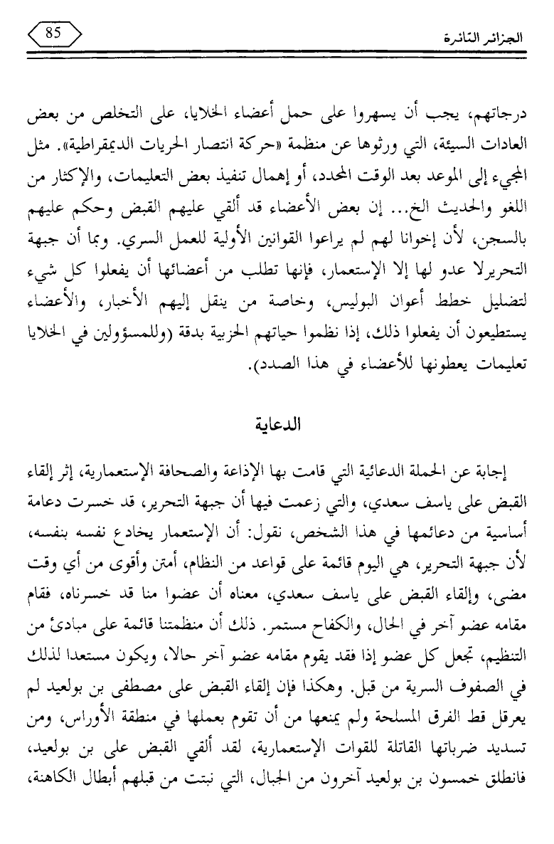 إجابة عن الحملة الدعائية التي قامت بها الإذاعة والصحافة الاستعمارية، إثر إلقاء القبض على ياسف سعدي، والتي زعمت فيها أن جبهة التحرير، قد خسرت دعامة أساسية من دعائمها في هذا الشخص، نقول: أن الاستعمار يخادع نفسه بنفسه، لأن جبهة التحرير، هي اليوم قائمة على قواعد من النظام، أمتن وأقوى من أي وقت - مضى، وإلقاء القبض على ياسف سعدي، معناه أن عضوا منا قد خسرناه، فقام مقامه عضو آخر في الحال، والكفاح مستمر. ذلك أن منظمتنا قائمة على مبادئ من التنظيم، نجعل كل عضو إذا فقد يقوم مقامه عضو آخر حالا، ويكون مستعدا لذلك في الصفوف السرية من قبل. وهكذا فإن إلقاء القبض على مصطفي بن بولعيد لم يعرقل قط الفرق المسلحة ولم يمنعها من أن تقوم بعملها في منطقة الأوراس، ومن تسديد ضرباتها القاتلة للقوات الاستعمارية، لقد ألقي القبض على بن بولعيد، فانطلق خمسون بن بولعيد آخرون من الجبال، التي نبتت من قبلهم أبطال الكاهنة،