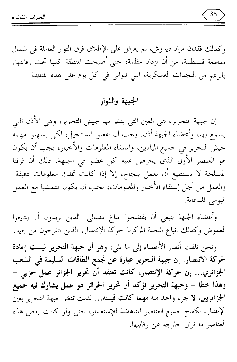 وأعضاء الجهة ينبغي أن يفضحوا اتباع مصالي، الذين يريدون أن يشيعوا الغموض وكذاك اتباع اللجنة المركزية لحركة الإنتصار، الذين يتفرجون من بعيد.