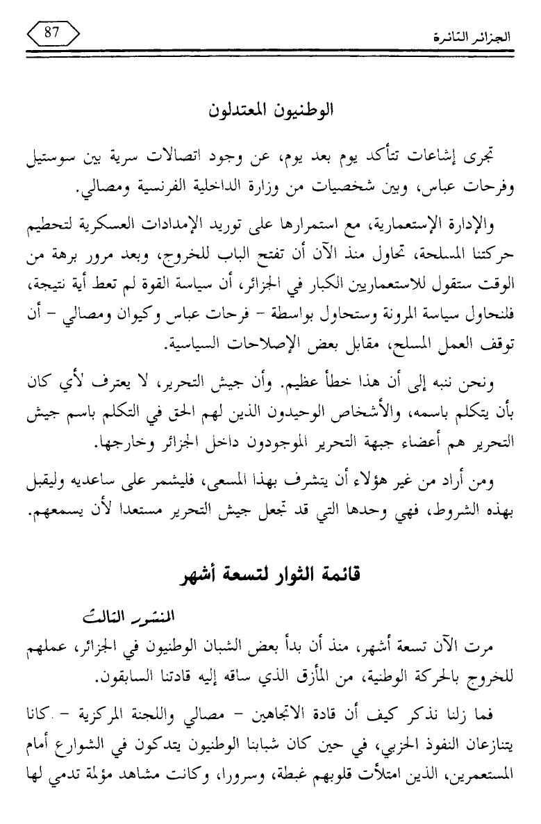 مرت الآن تسعة أشهر، منذ أن بدأ بعض الشبان الوطنيون في الجزائر، عملهم للخروج بالحركة الوطنية، من المأزق الذي ساقه إليه قادتنا السابقون.