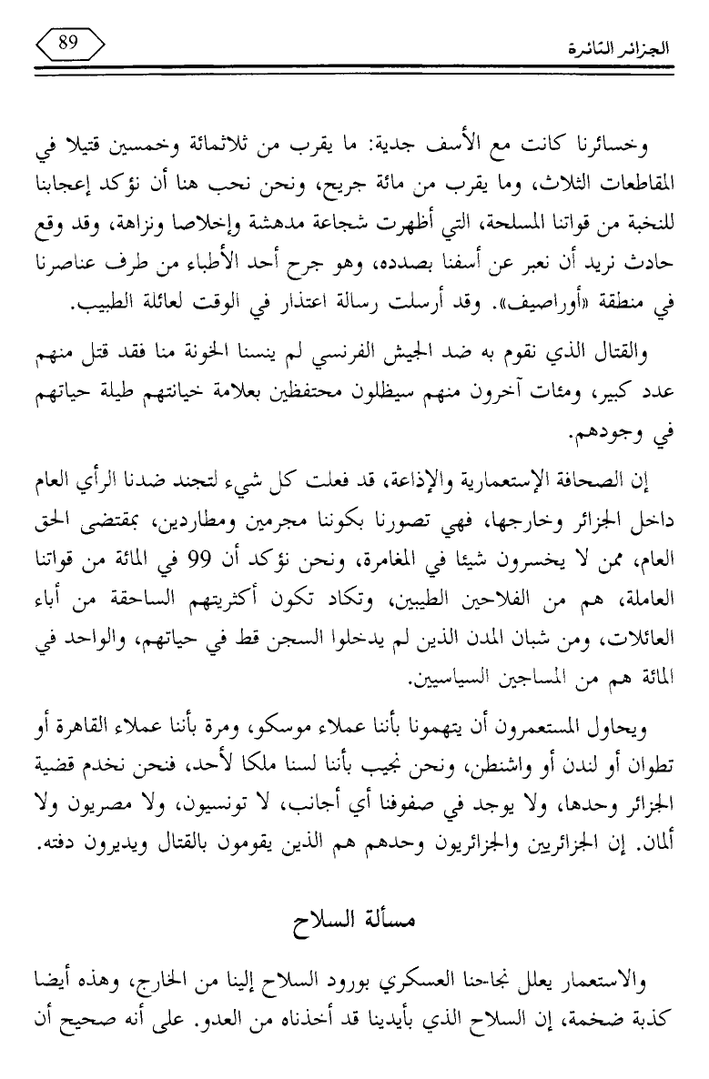 وخسائرنا كانت مع الأسف جدية: ما يقرب من ثلاثمائة وخمسين قتيلا في المقاطعات الثلاث، وما يقرب من مائة جريح، ونحن نحب هنا أن نؤكد إعجابنا للنخبة من قواتنا المسلحة، التي أظهرت شجاعة مدهشة وإخلاصا ونزاهة، وقد وقع حادث نريد أن نعبر عن أسفنا بصدده، وهو جرح أحد الأطباء من طرف عناصرنا في منطقة "أوراصيف". وقد أرسلت رسالة اعتذار في الوقت لعائلة الطبيب.